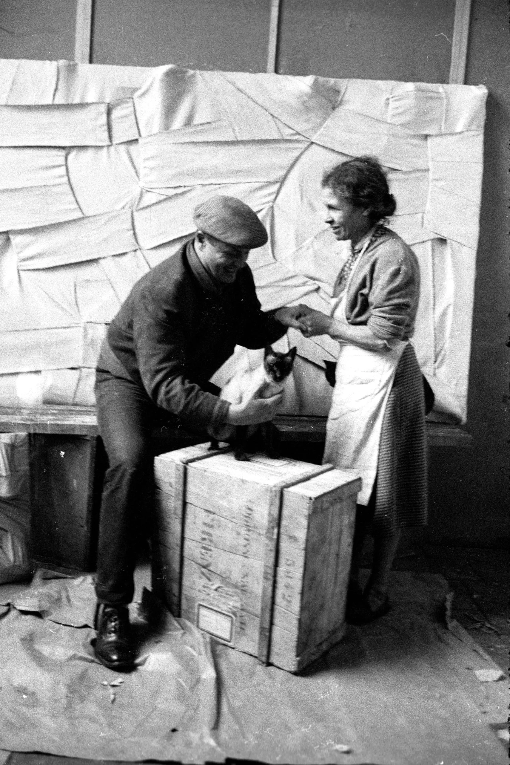 Black and white photograph of a man and woman leaning over stacked wooden crates toward a cat, a large wrapped canvas visible behind them