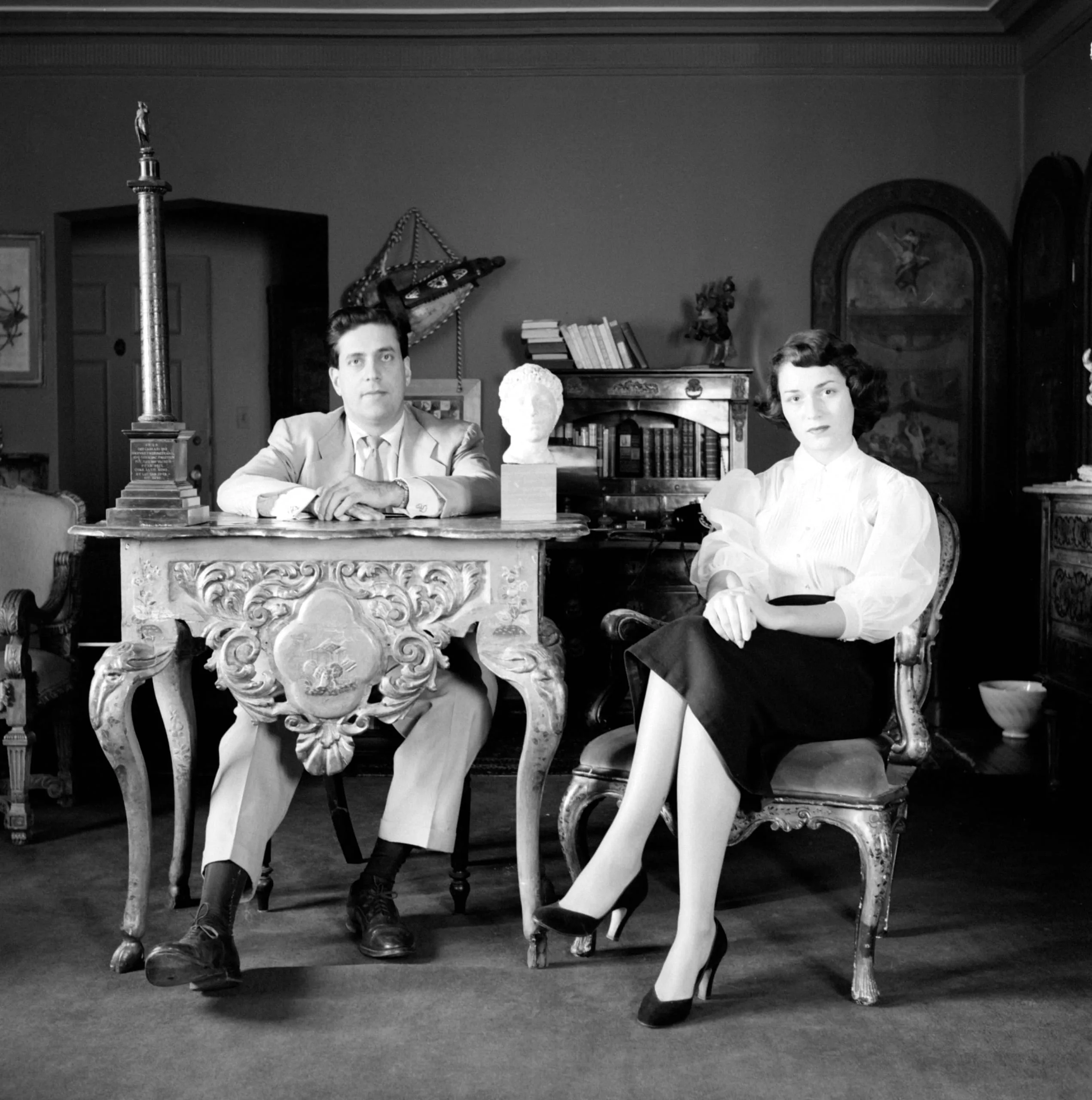 Black and white photograph of a man and woman seated in an ornate interior, he behind a carved gilt desk, she in a gilded armchair, both facing the camera
