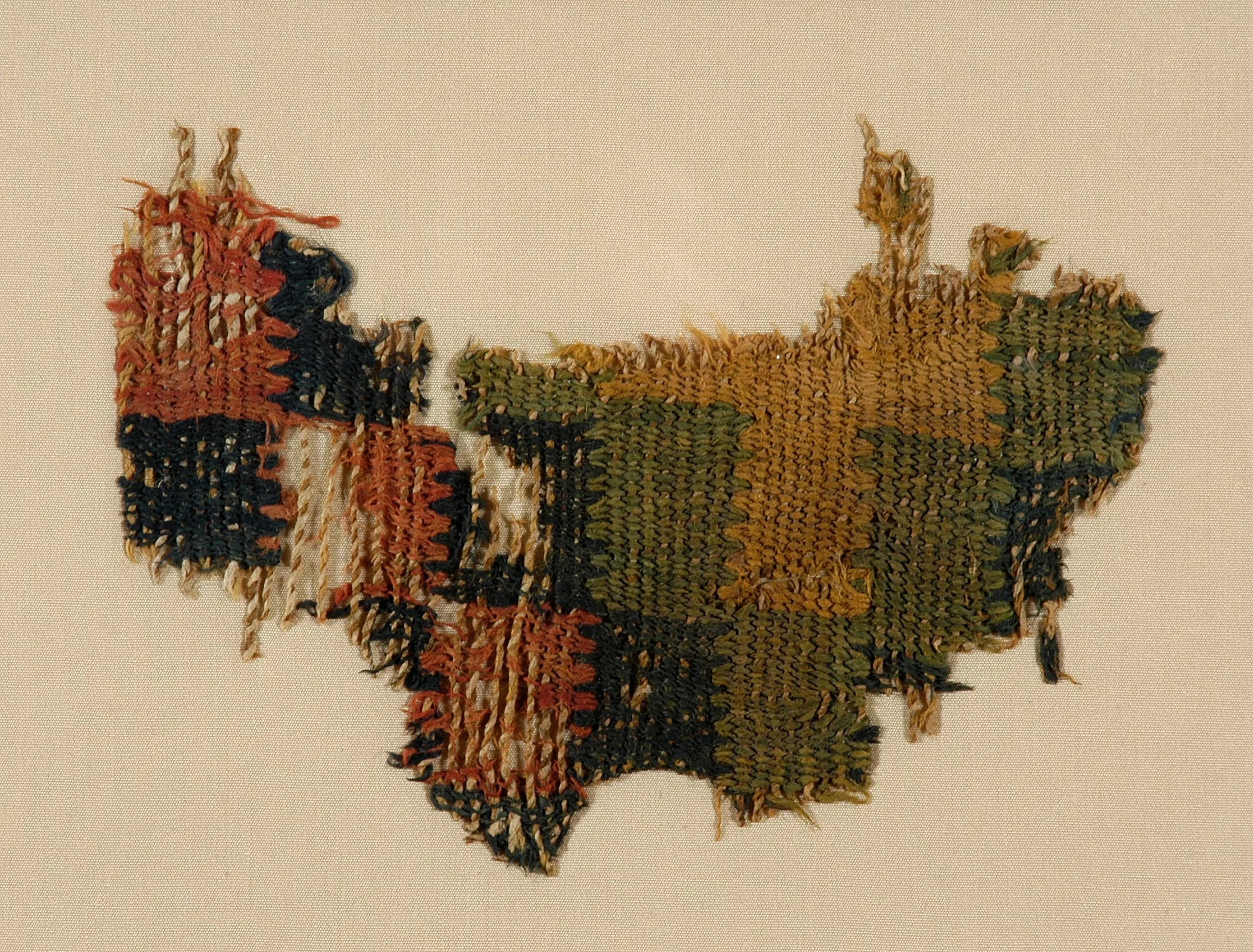 Textile fragment with plaid weave pattern in brick red, navy blue, olive green, and ochre, with frayed and torn edges