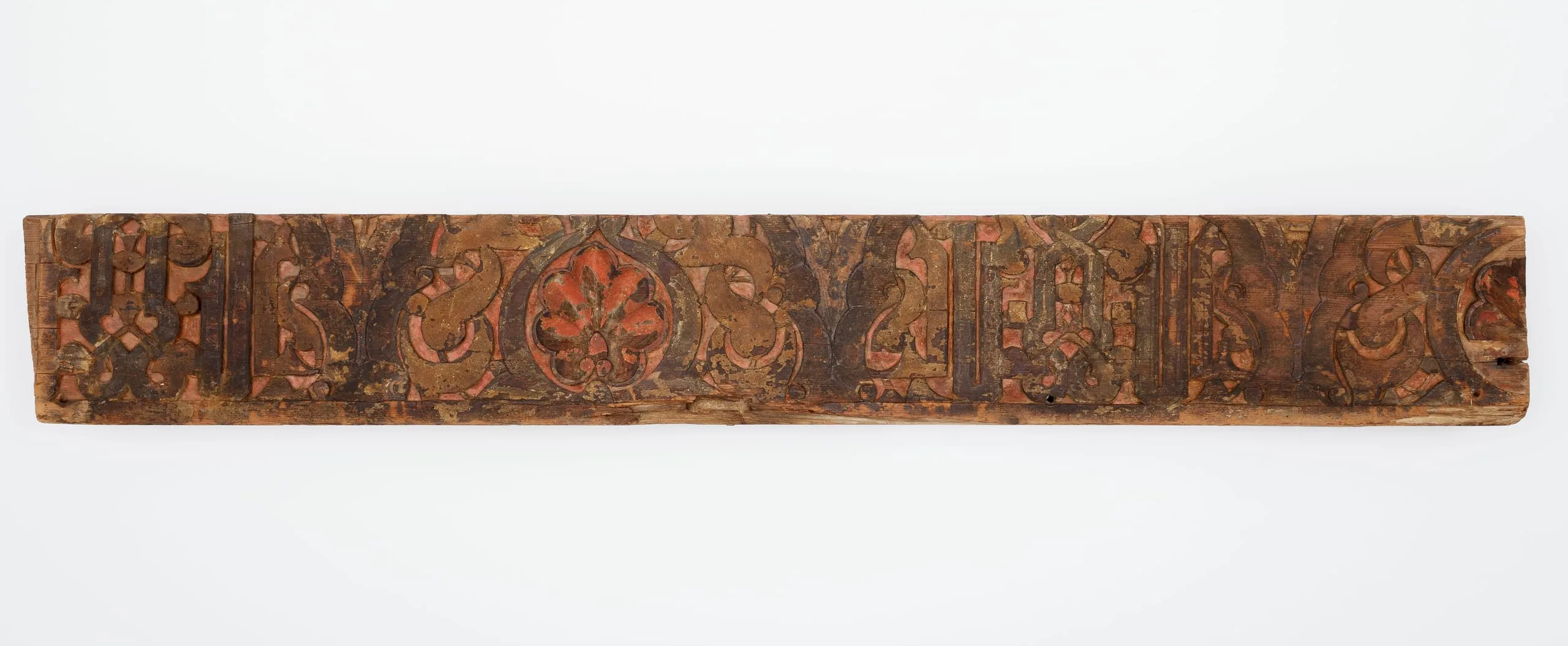 The Berber-descended Marinid rulers of Morocco (1244–1465) were important patrons of art and architecture who often hired immigrant craftsmen from Islamic Spain to decorate the religious monuments they commissioned. The result is a series of mosques and madrasas (religious schools) with interior walls covered by intricate stuccowork, tile mosaics, and meticulously carved wood paneling of a distinctively Spanish inspiration. This wood plank, which likely comes from one such Marinid religious institution, is probably the lower half of a two-board panel, with a repeated Arabic inscription (the word "al-Yumn" or prosperity, written forward and backward), vegetal designs, and a seashell motif enclosed within cusped arches.