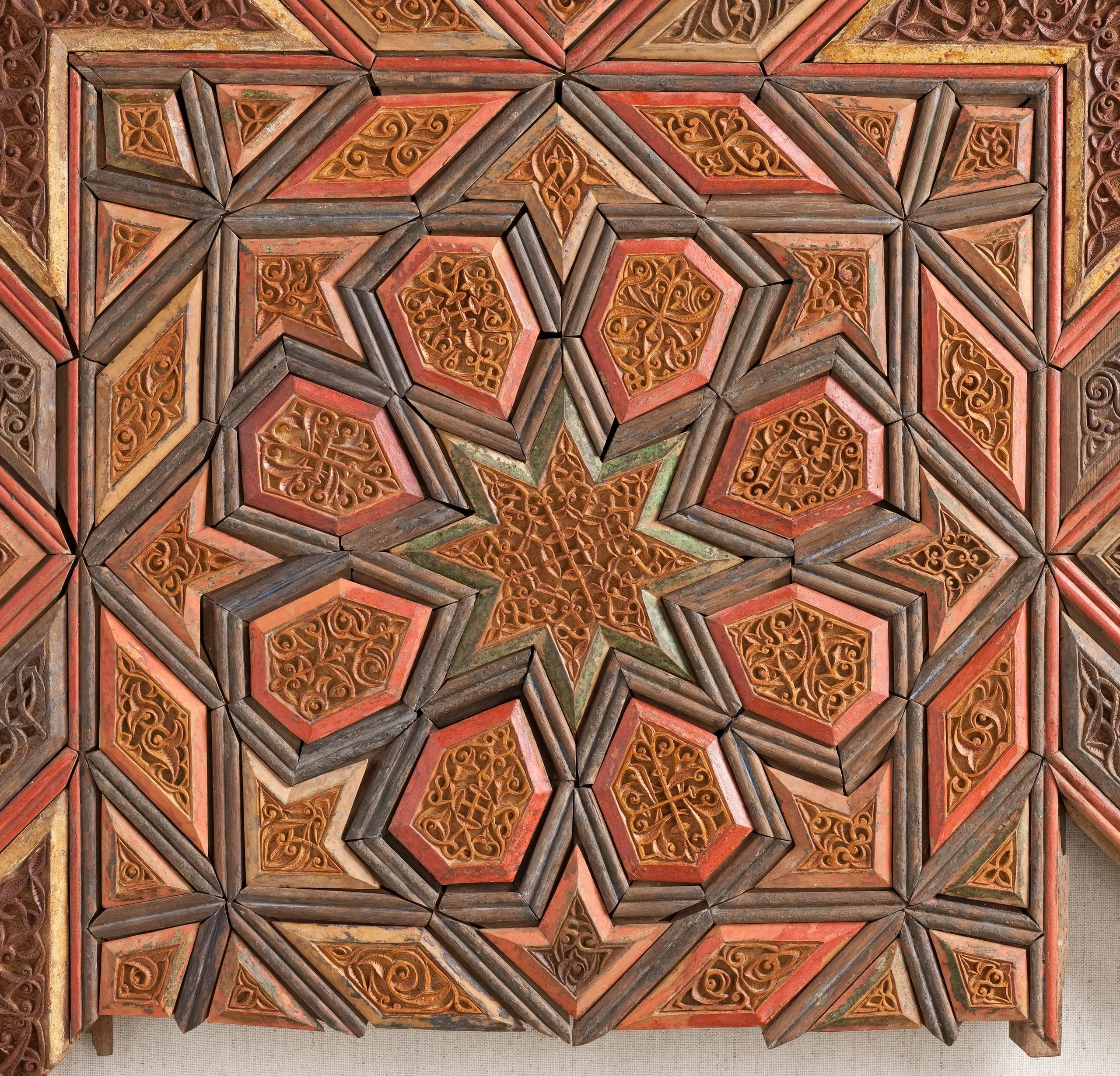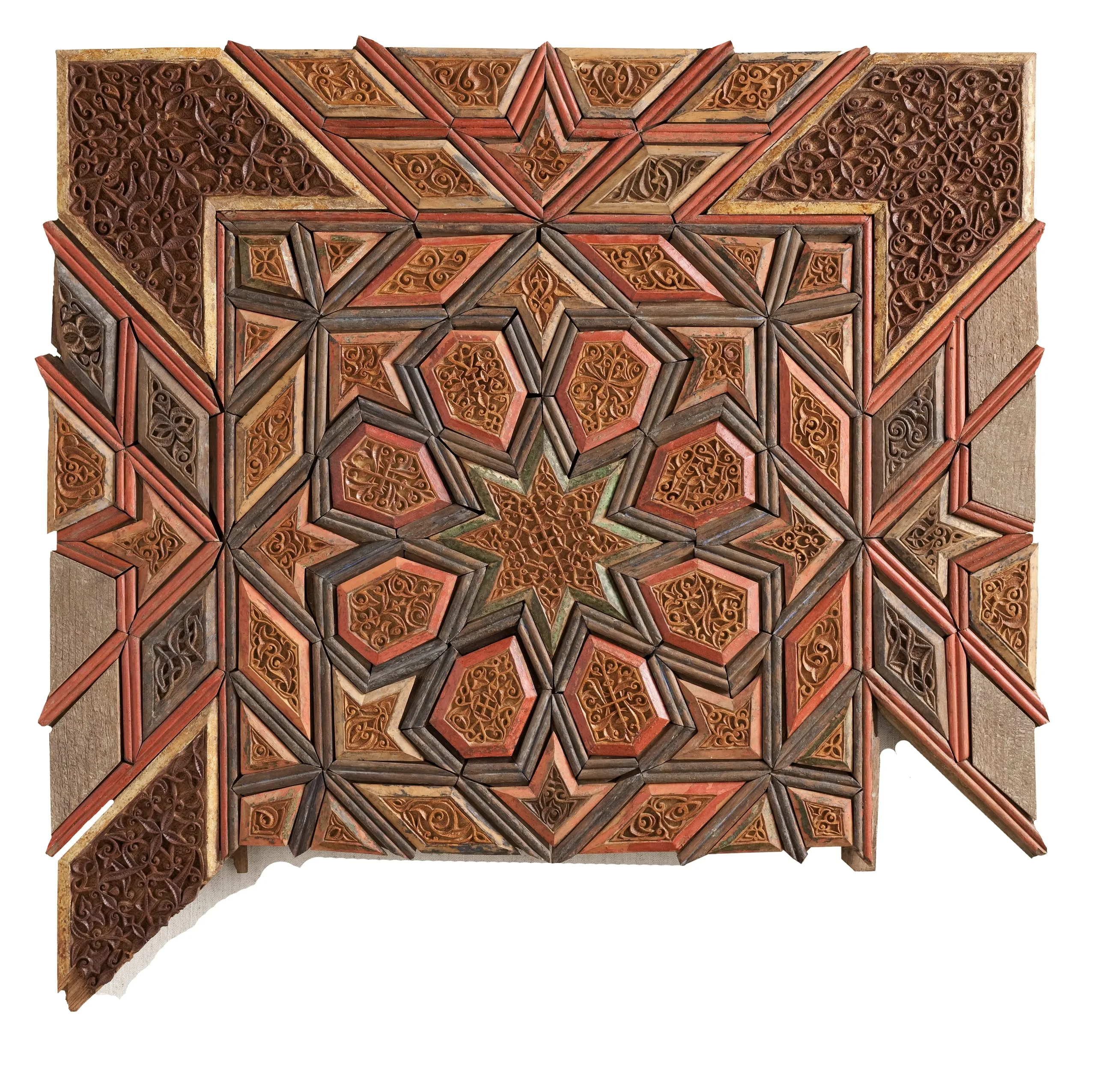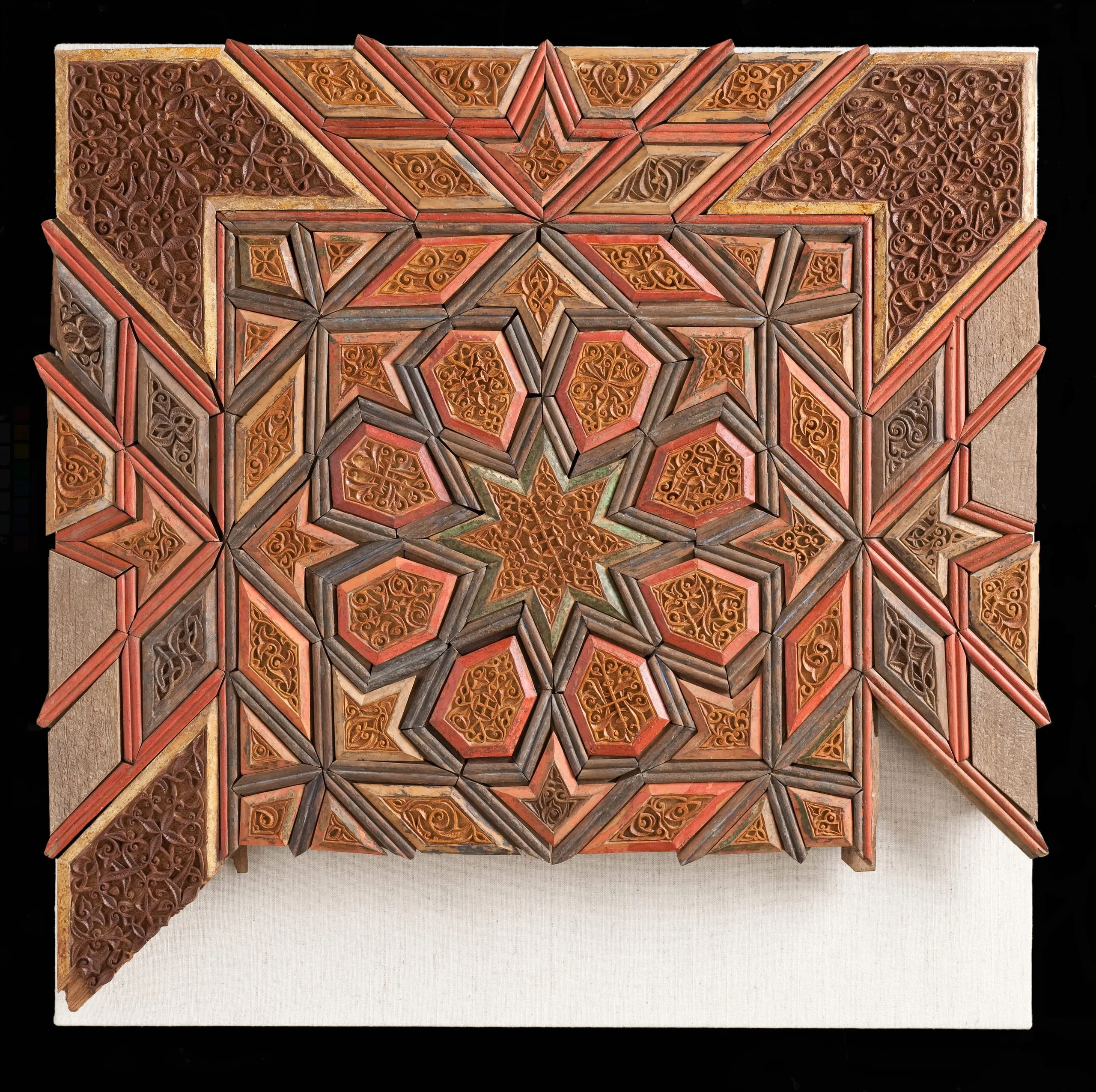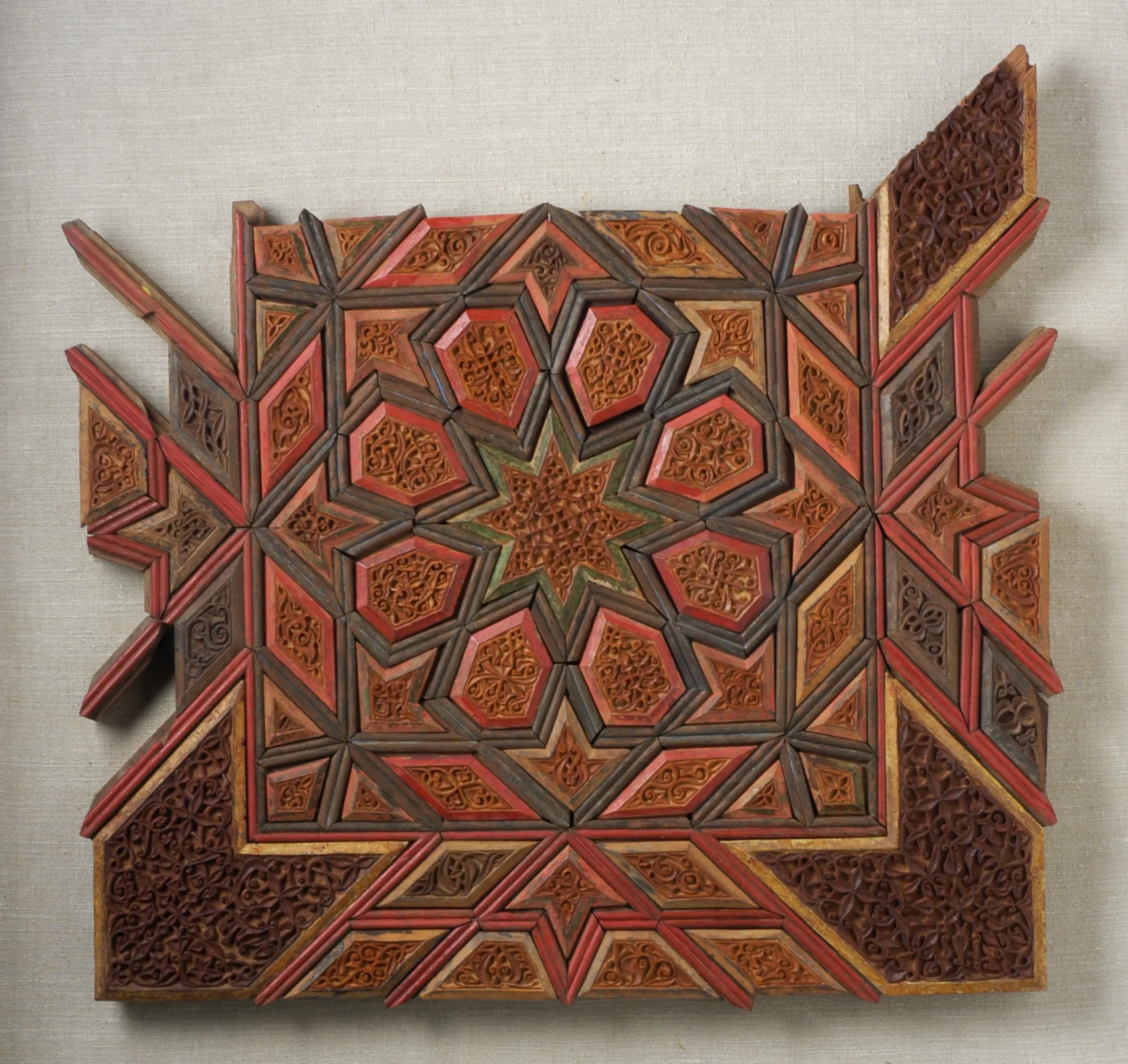Due to their inherent fragility, wood objects from the medieval Islamic world do not survive in great numbers, and those that do are primarily from interior settings, where they were protected from the elements. Most extant examples from Iran can be associated with religious institutions, in which they were safeguarded from the frequent warfare punctuating the rise and fall of dynasties and the ensuing destruction of palaces and other secular edifices. This painted wood panel, constructed from numerous individual pieces that fit together with tongue-in-groove attachments, may have formed part of a cenotaph (grave marker) from a tomb or perhaps a minbar (pulpit) from a mosque.