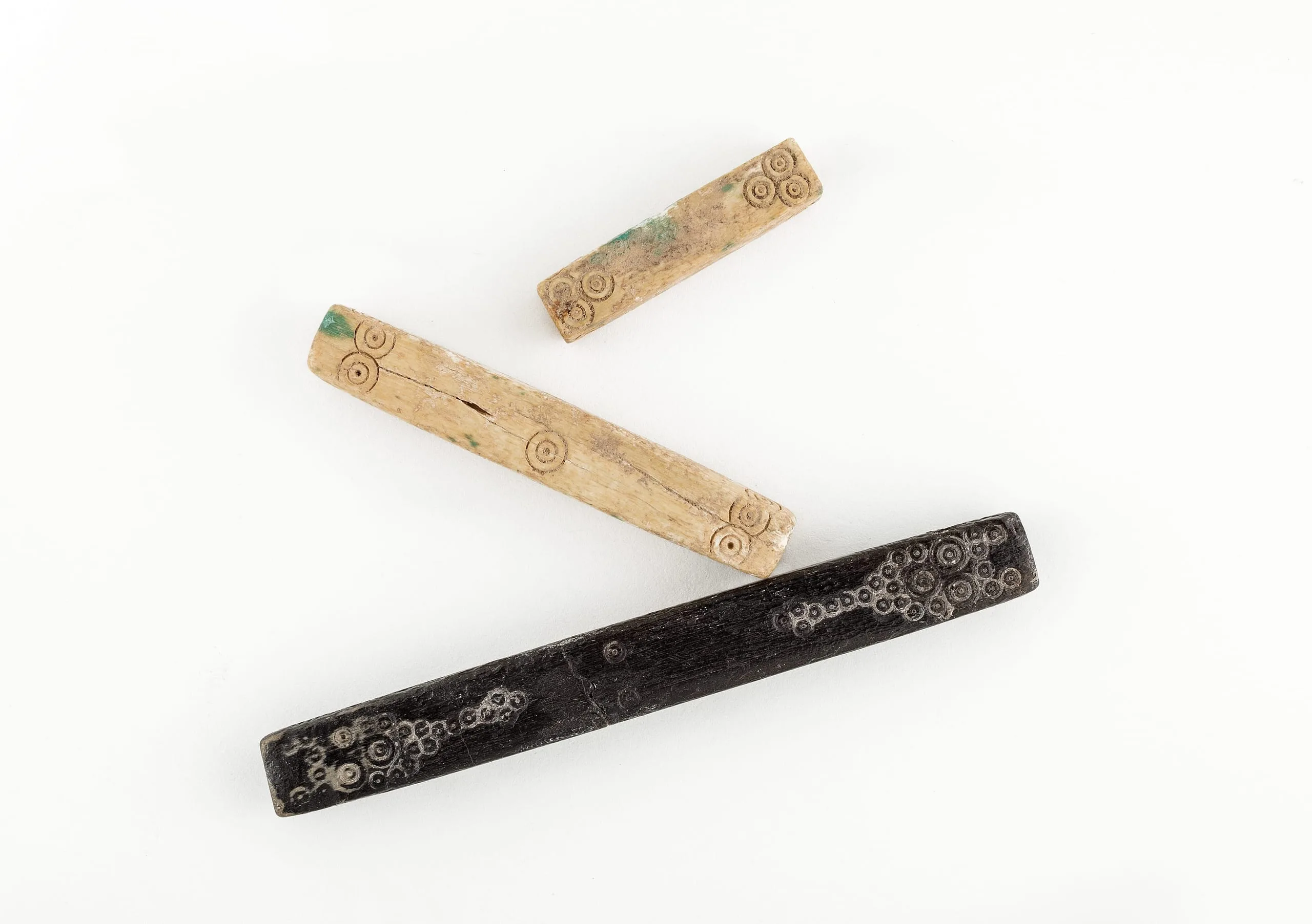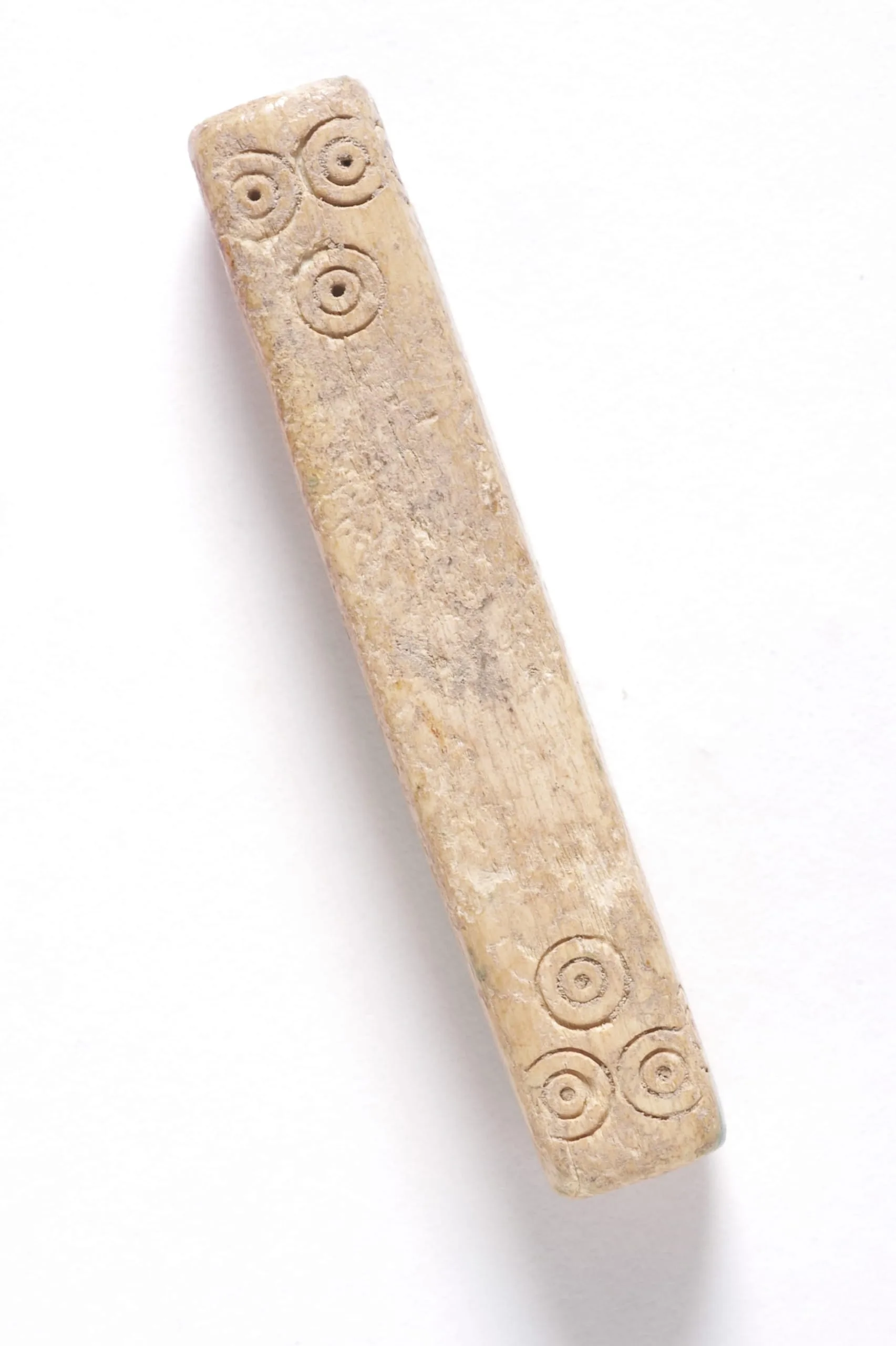 Carved from bone and decorated with circular carvings on all sides, these rectangular objects (also see M.2002.1.526 and M.2002.1.527) were likely a form of dice used to play backgammon and other games of chance and skill. Such games often entailed an element of gambling, which was forbidden by Islamic law but continued to be enjoyed by all levels of society in the medieval Islamic world. The use of dice in gaming seems to date to the fifth millennium BC, with the earliest surviving example coming from Syria.