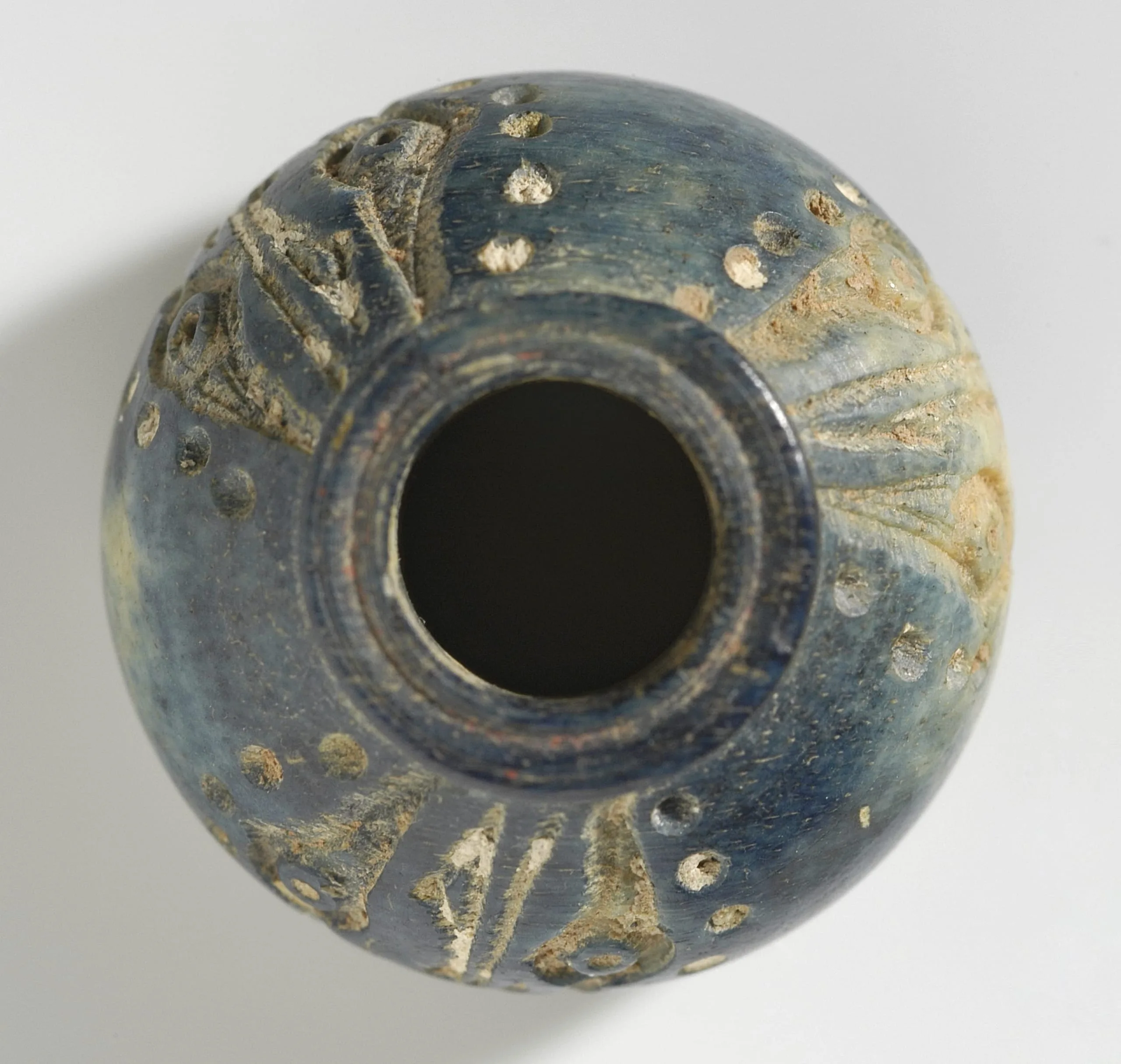Ceramic vessel photographed from above, nearly spherical with a narrow neck, covered in worn slate blue glaze with raised leaf-shaped and dotted relief decoration