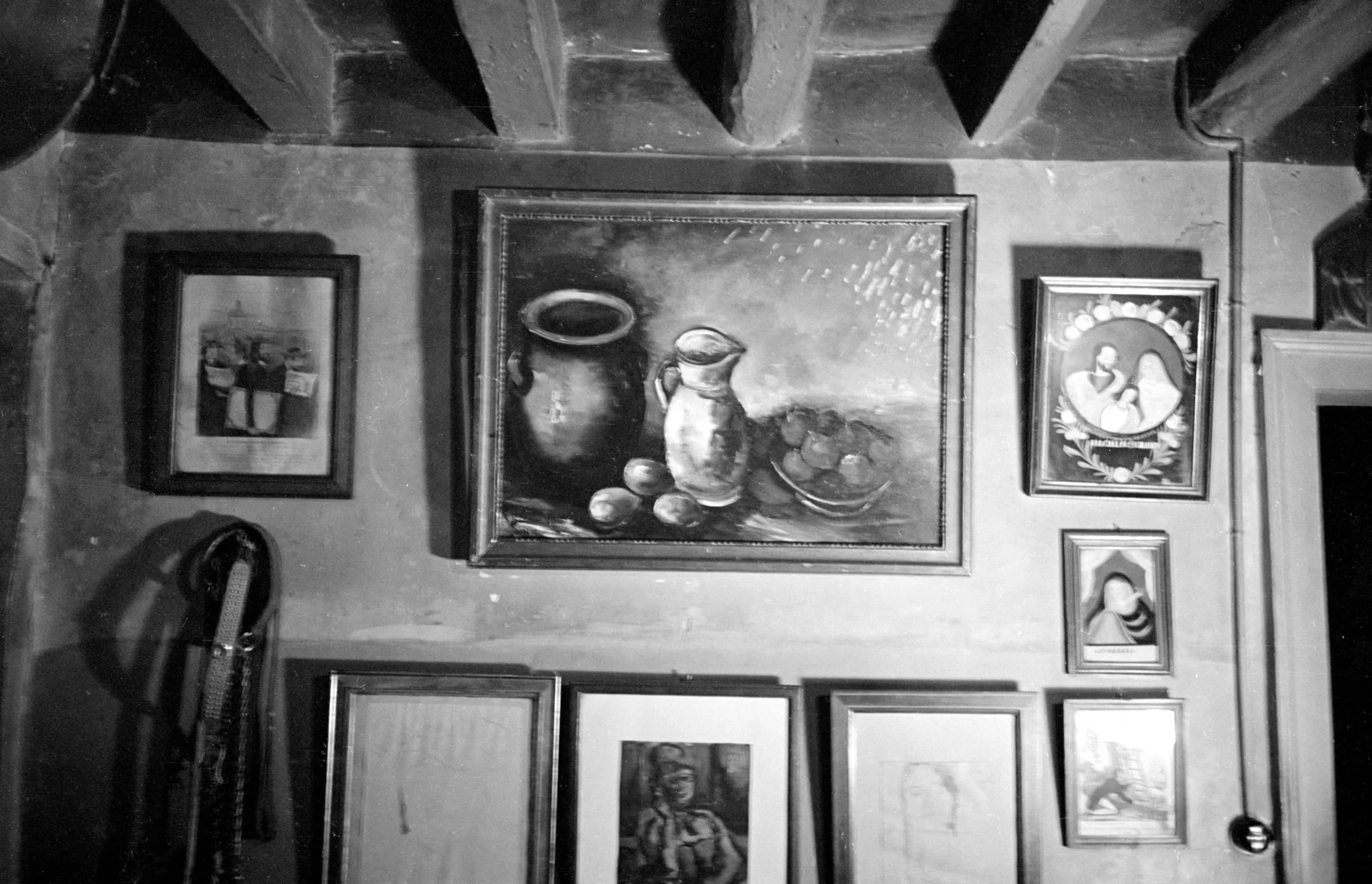 Black and white photograph of an interior wall hung with multiple framed artworks, centered on a still life painting of jugs and a fruit bowl