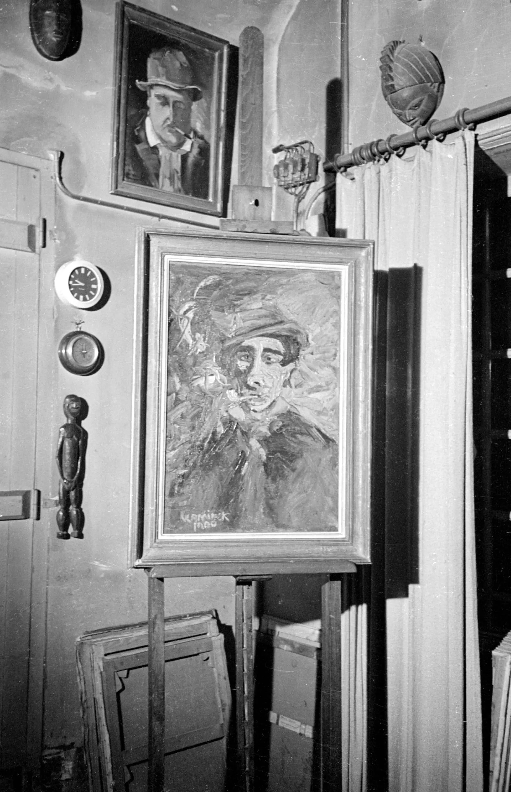 Black and white photograph of a studio interior with two framed paintings — one on an easel with gestural brushwork, one hung on the wall — surrounded by clutter including clocks, a carved figurine, and stacked canvases