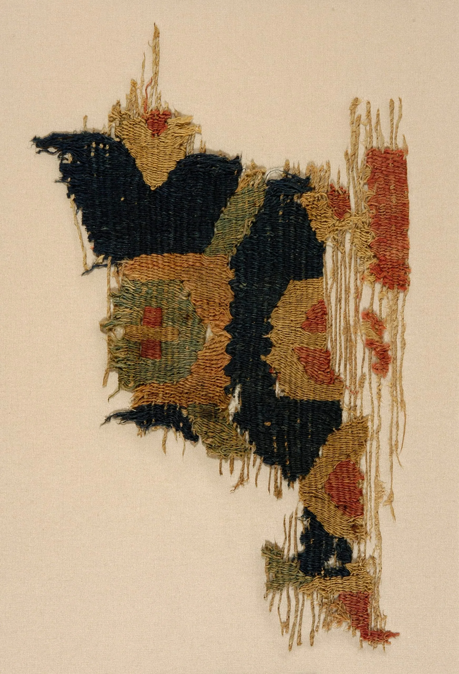 Fragmentary woven textile with ragged edges and hanging warp threads, showing a repeating bird or wing motif in midnight blue on a tan ground with brick red, rust, and olive green accents