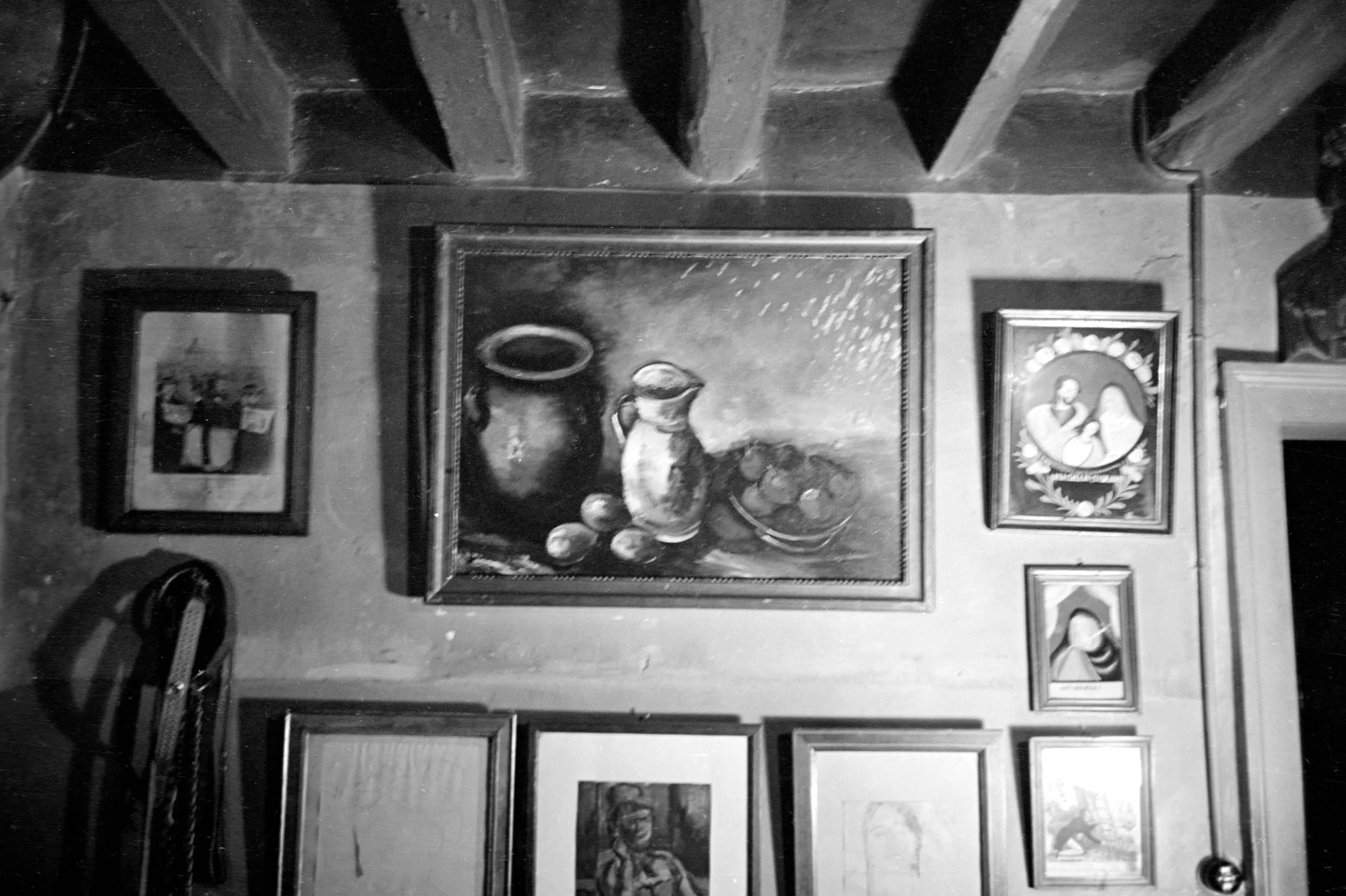 Black and white photograph of a plaster wall hung with multiple framed artworks, centered on a still life oil painting of ceramic vessels and fruit