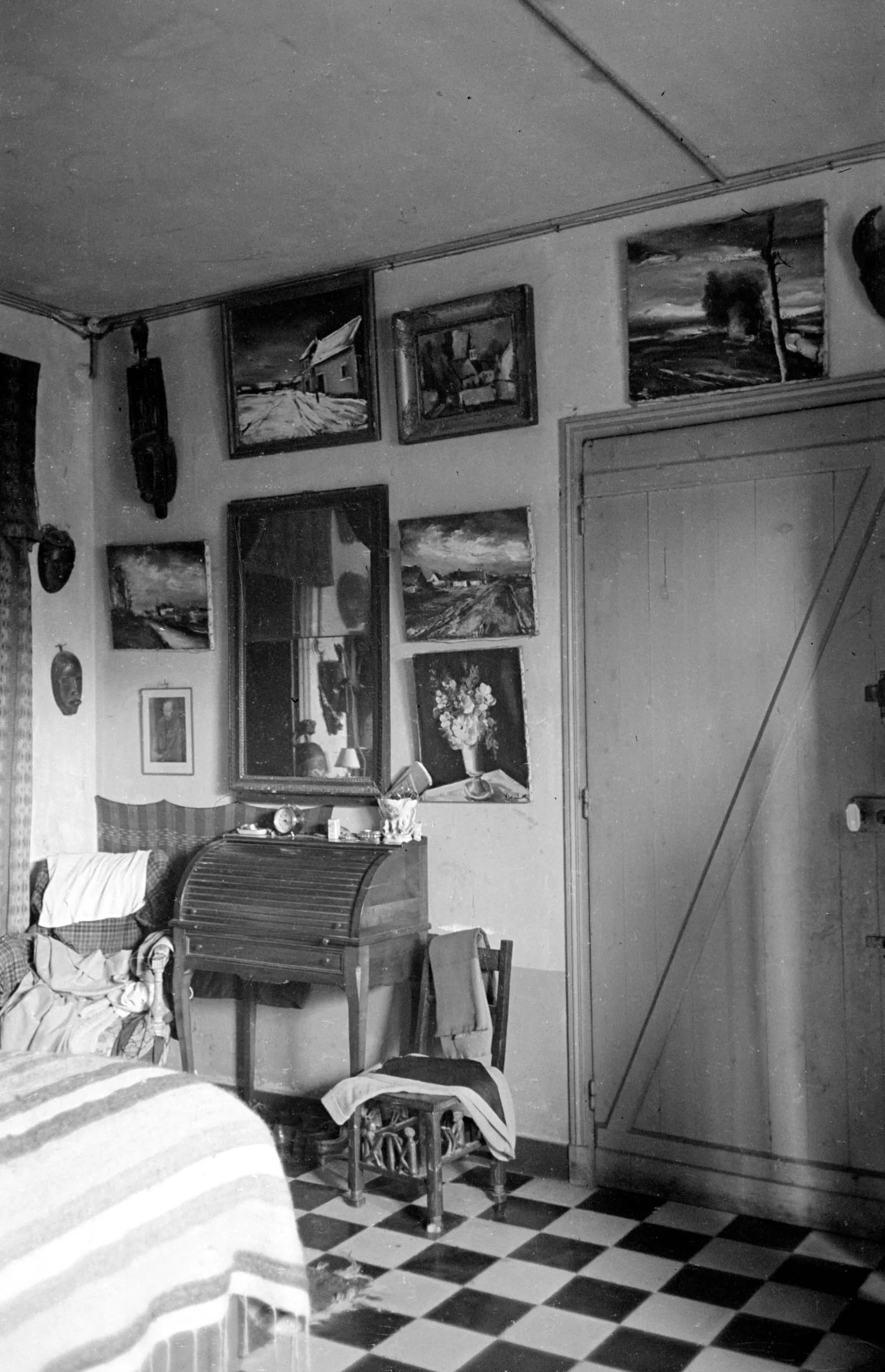 Black and white photograph of a room interior with walls densely hung with landscape paintings, a roll-top desk, wicker stool, and checkered tile floor