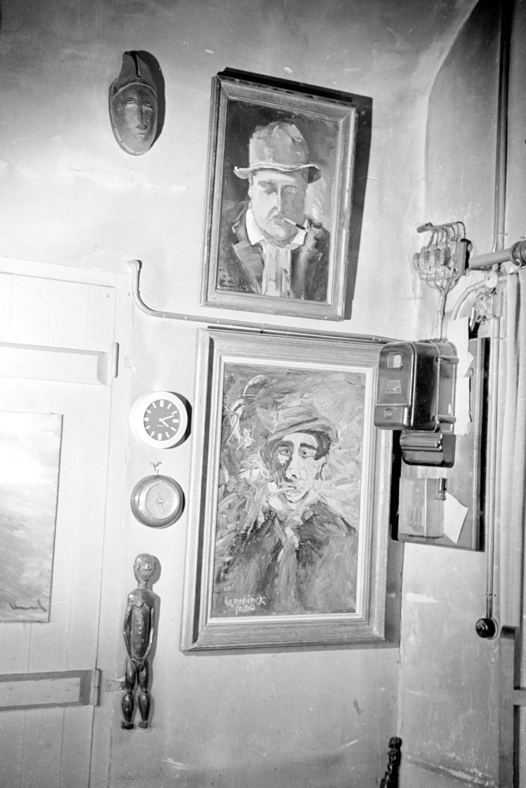 Black and white photograph of a room interior with two framed portrait paintings stacked on a plaster wall, surrounded by a carved mask, a wall clock, a small wooden figurine, and an electrical panel