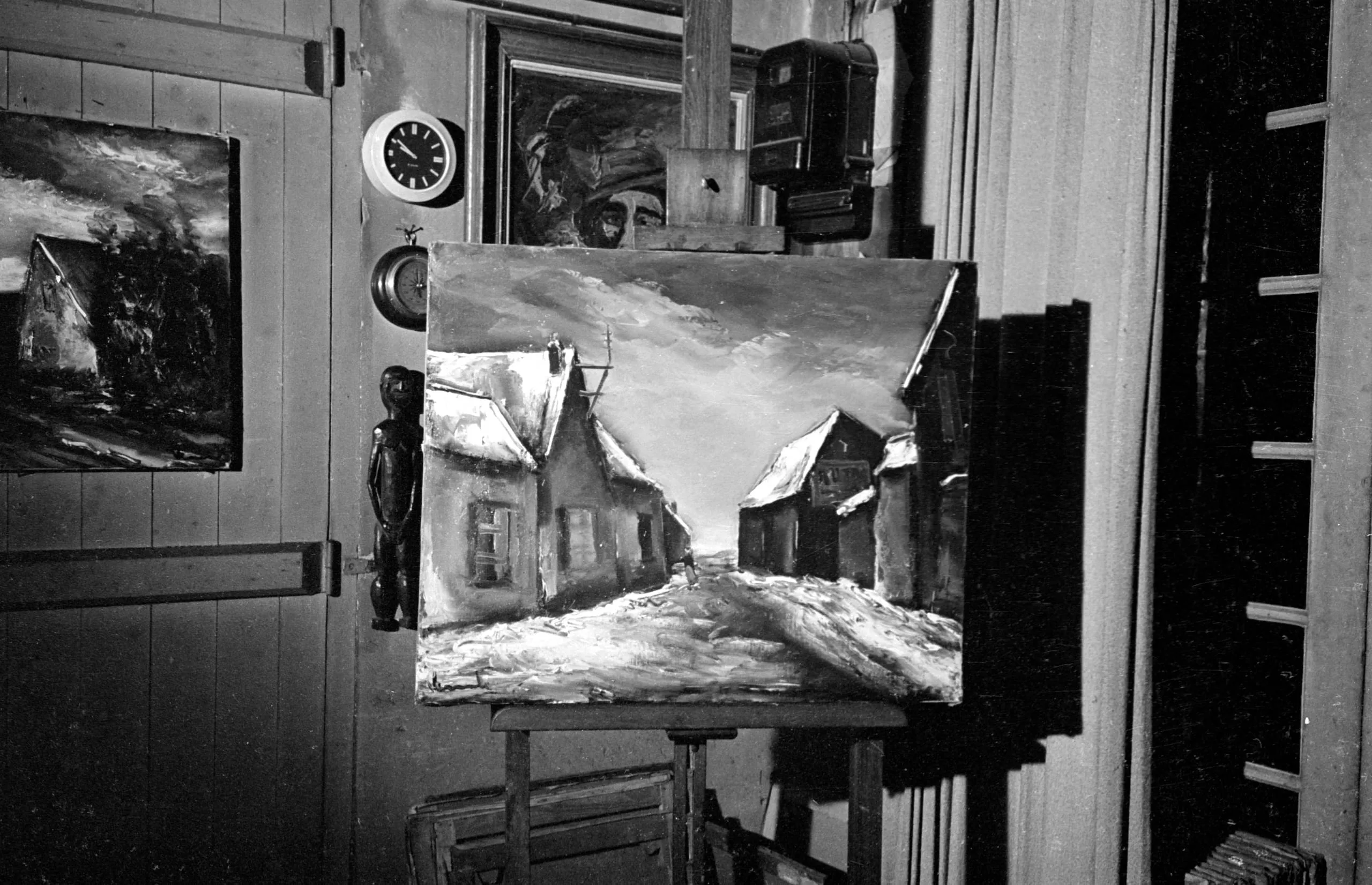 Black and white photograph of an artist's studio interior, centered on a snow-covered village street painting displayed on a wooden easel, surrounded by other artworks and studio objects