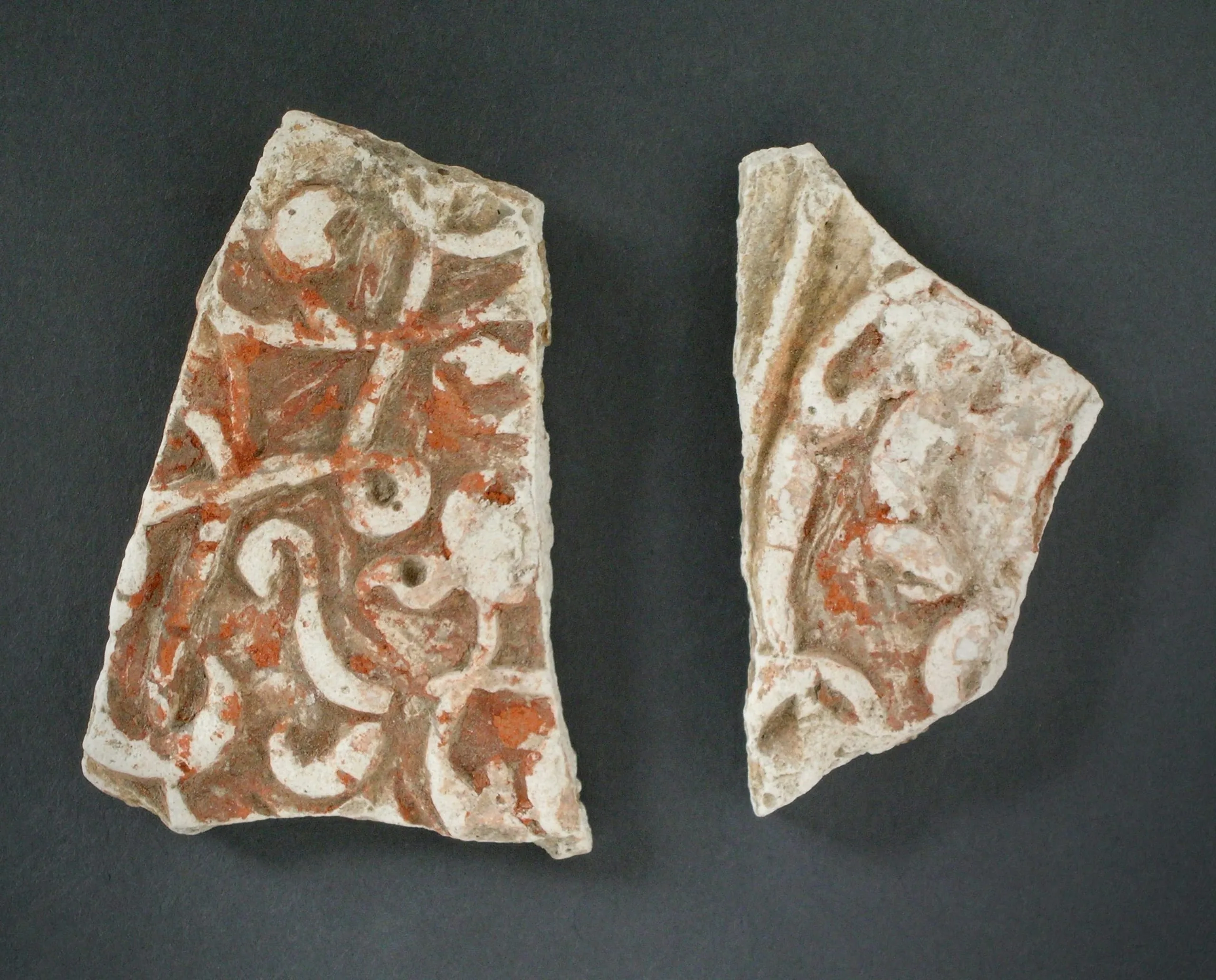 Two broken ceramic or plaster relief fragments with carved scrolling foliate motifs and traces of red and white pigment, displayed on a gray surface