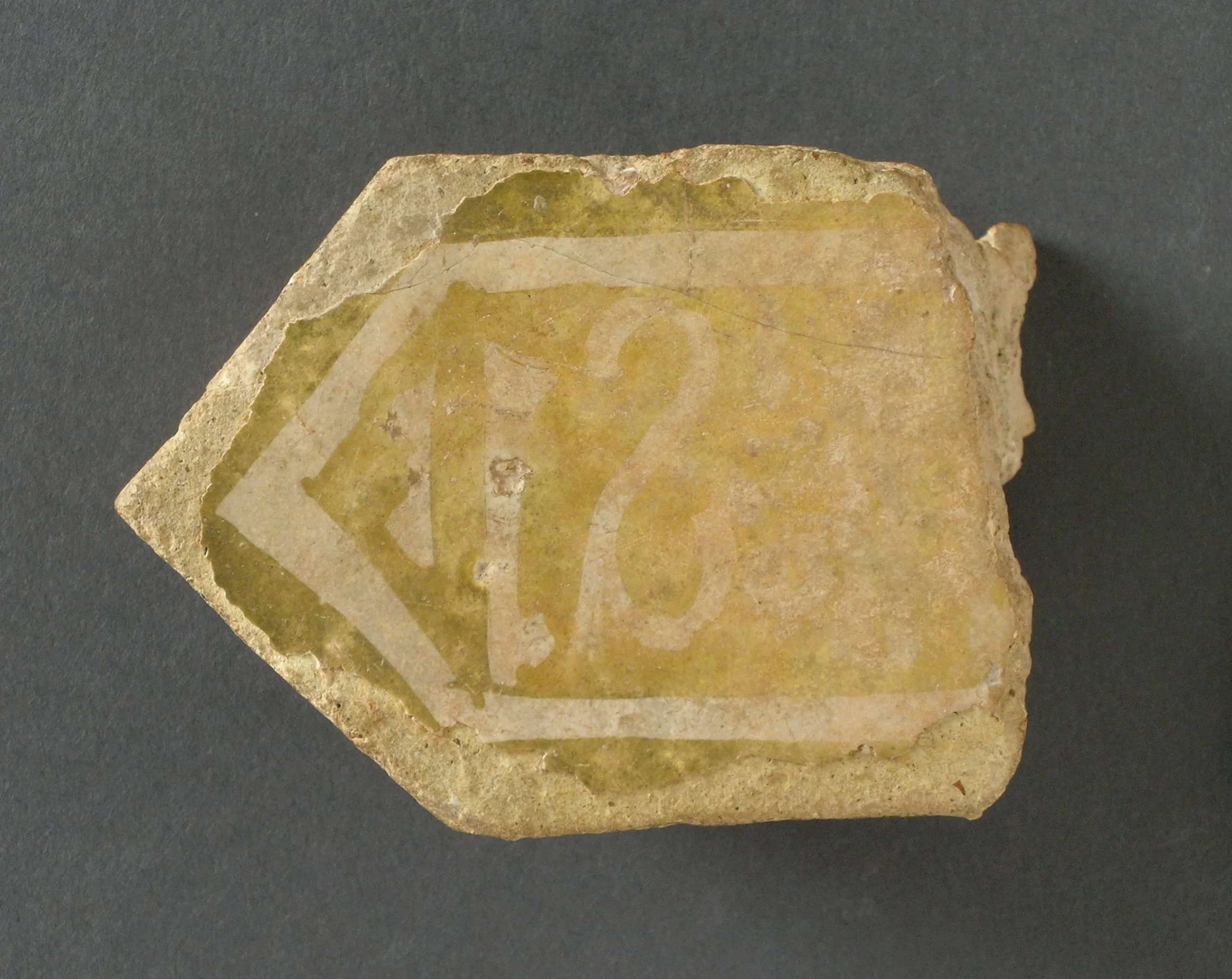 Ceramic tile fragment with yellow-green glaze, cream slip border in a chevron outline, and a single cursive Arabic script character in the center field