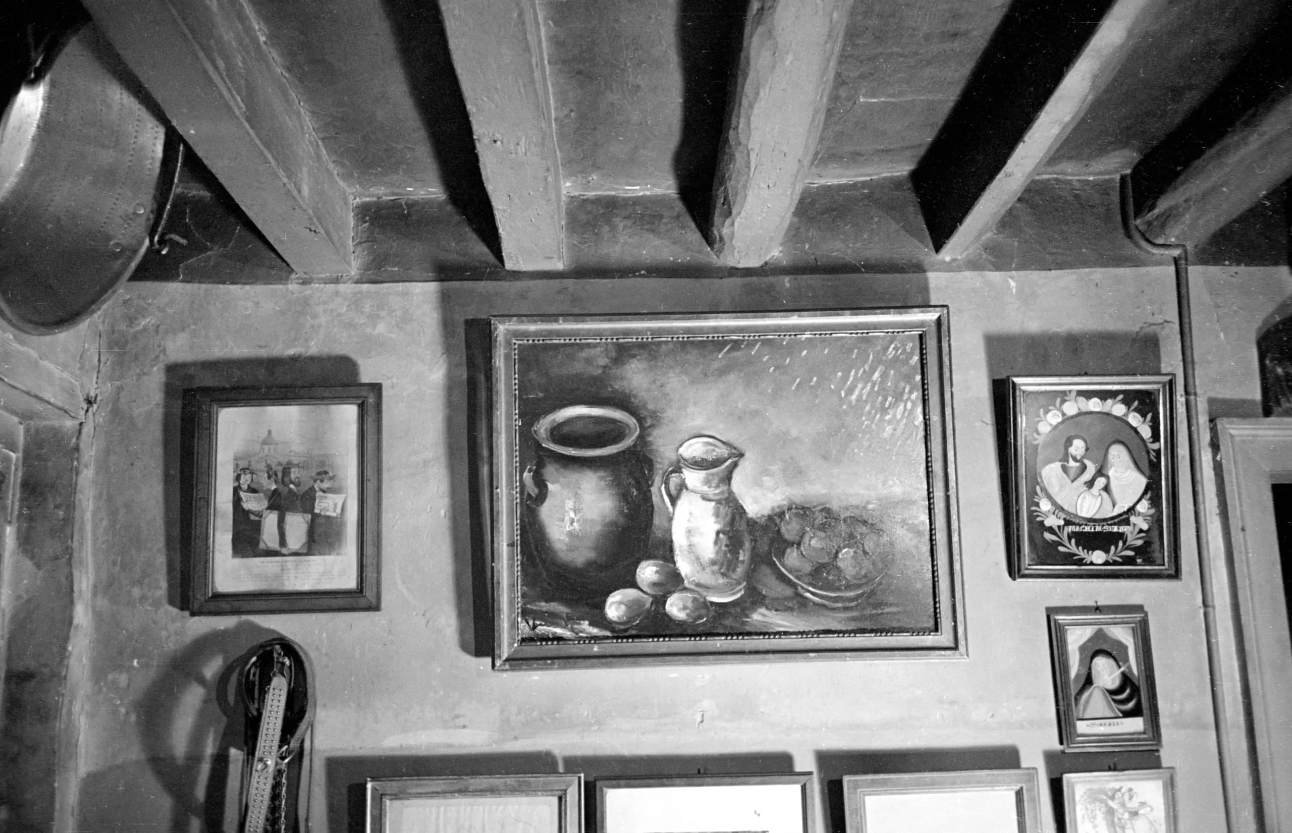 Black and white photograph of a plastered interior wall hung with multiple framed artworks beneath exposed wooden ceiling beams, centered on a still life painting of ceramic jugs and fruit