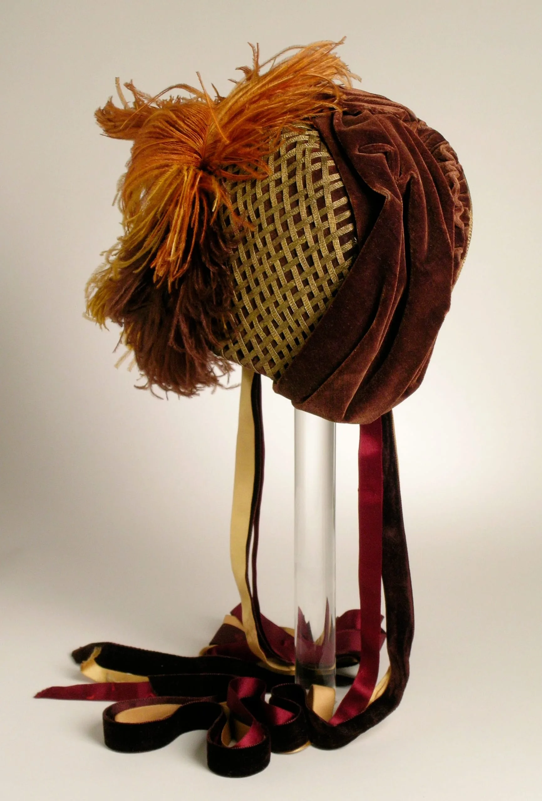 - Silk velvet, ostrich feathers, metallic thread ribbon trim, silk velvet and silk satin ribbon ties