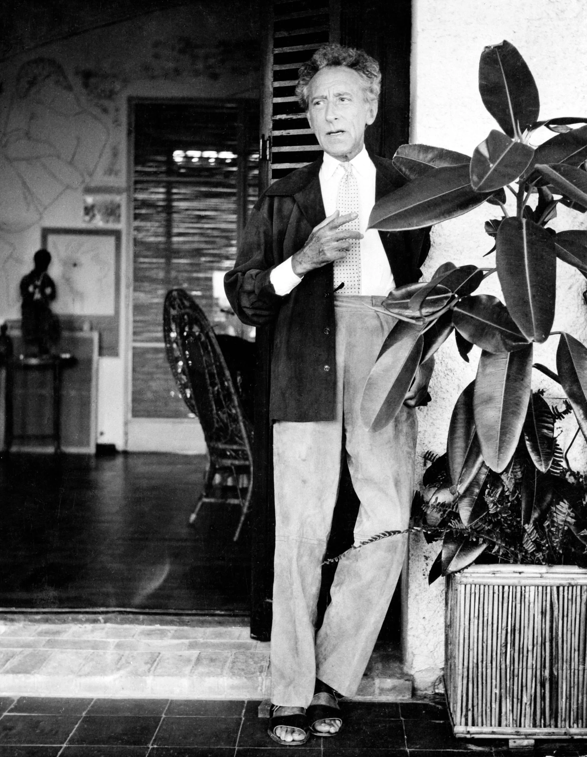 Black and white photograph, full-length portrait of a lean older man in a blazer, dress shirt, and loose trousers, standing near a doorway beside a large potted tropical plant, one hand raised mid-gesture