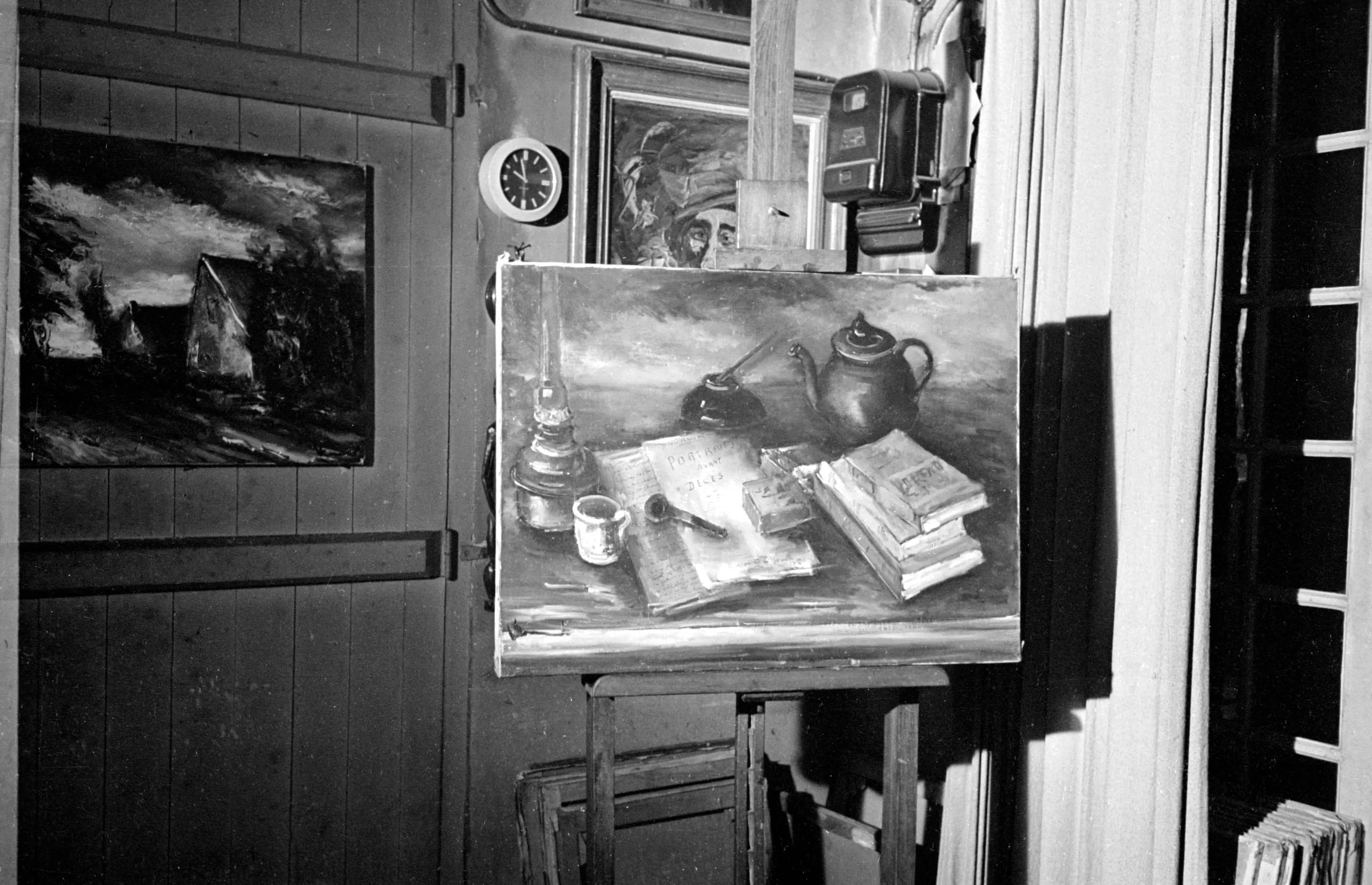 Black and white photograph of an artist's studio with a still life painting on a wooden easel, surrounded by other artworks, books, and studio clutter