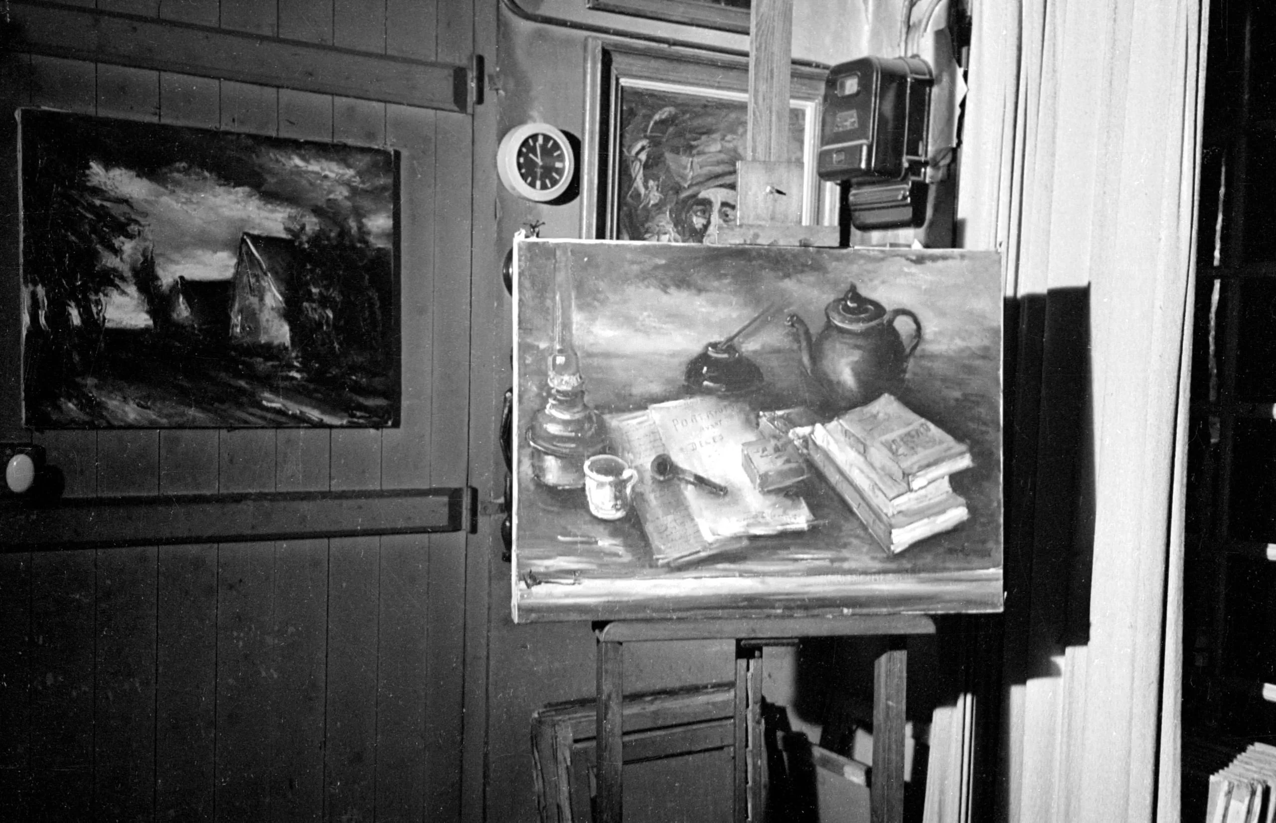 Black and white photograph of an artist's studio interior with two paintings visible: a dark landscape on the wall and a still life with books, teapot, and oil lamp on an easel