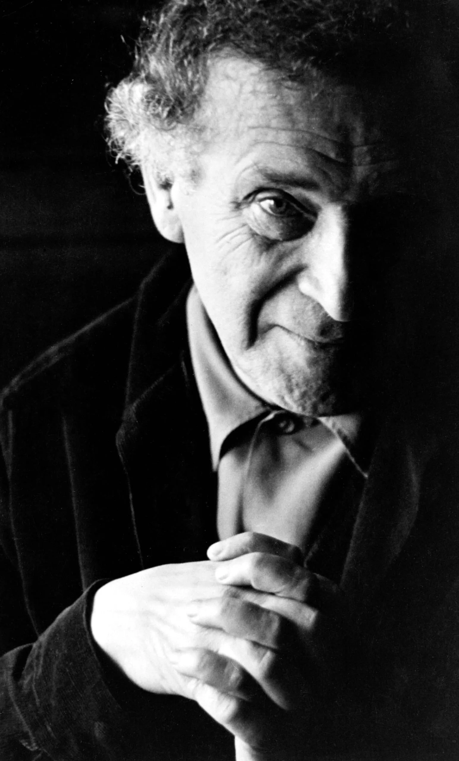 High-contrast black and white portrait photograph of an older man with curly gray hair, deeply lined face, looking right, hands clasped near chin