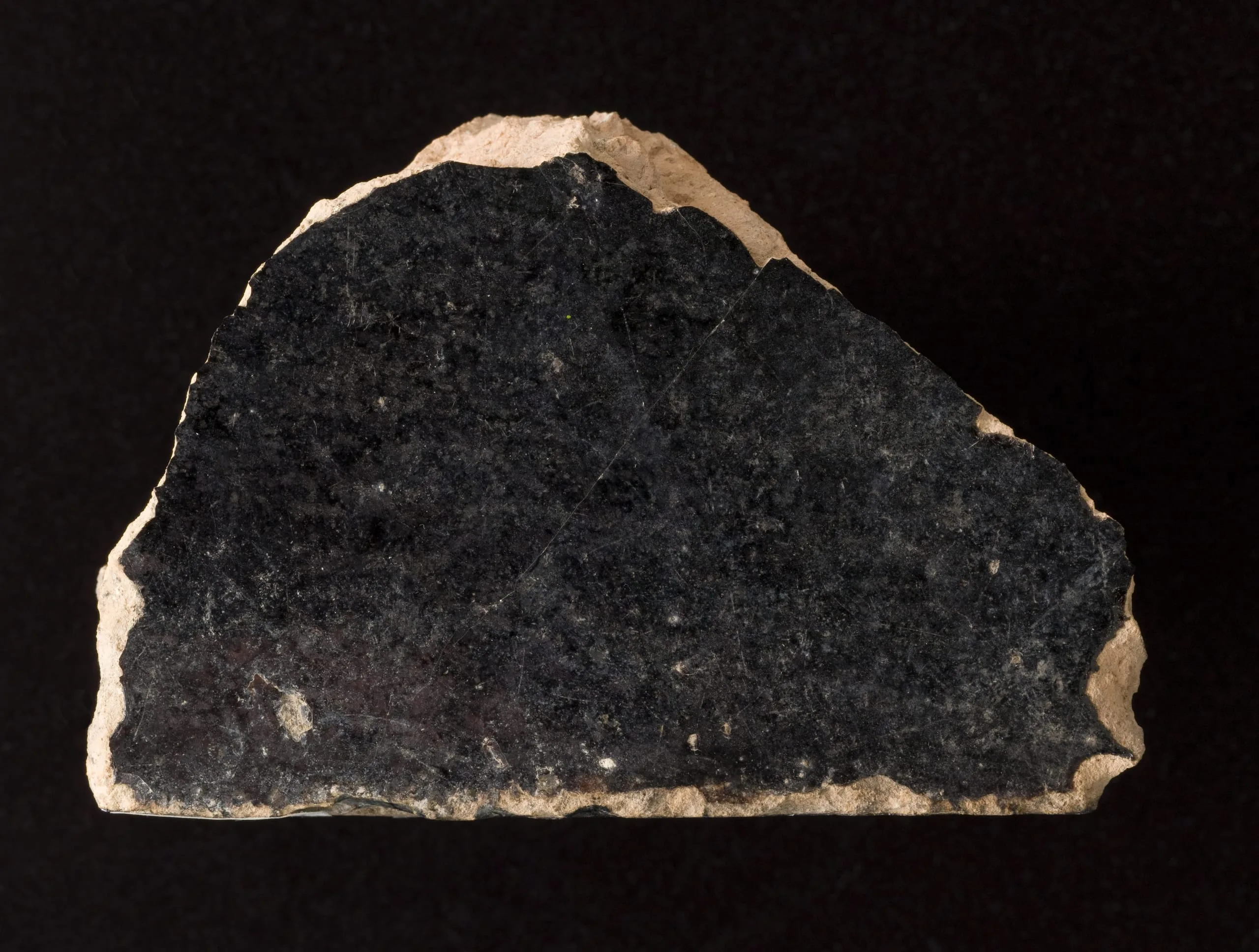 Broken stone fragment with a smooth, polished charcoal-black face speckled with pale gray flecks and rough parchment-tan edges, viewed against a black background
