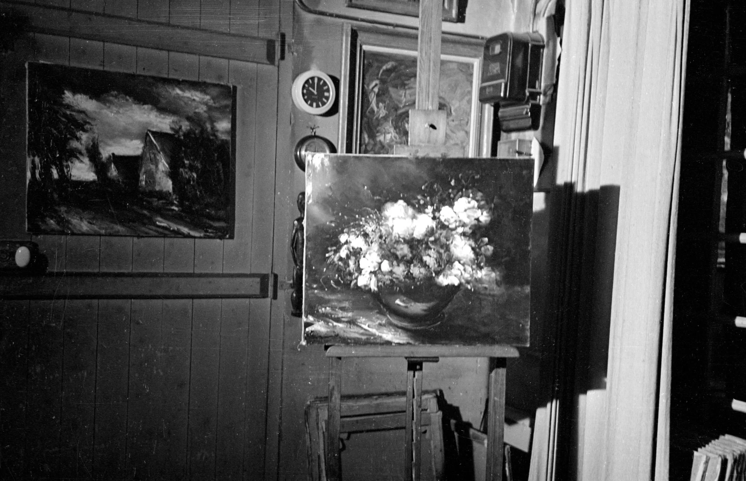 Black and white photograph of an artist's studio interior, with a still life painting of white flowers in a dark bowl displayed on a wooden easel, smaller landscape painting on the wall to the left, and a round clock between them