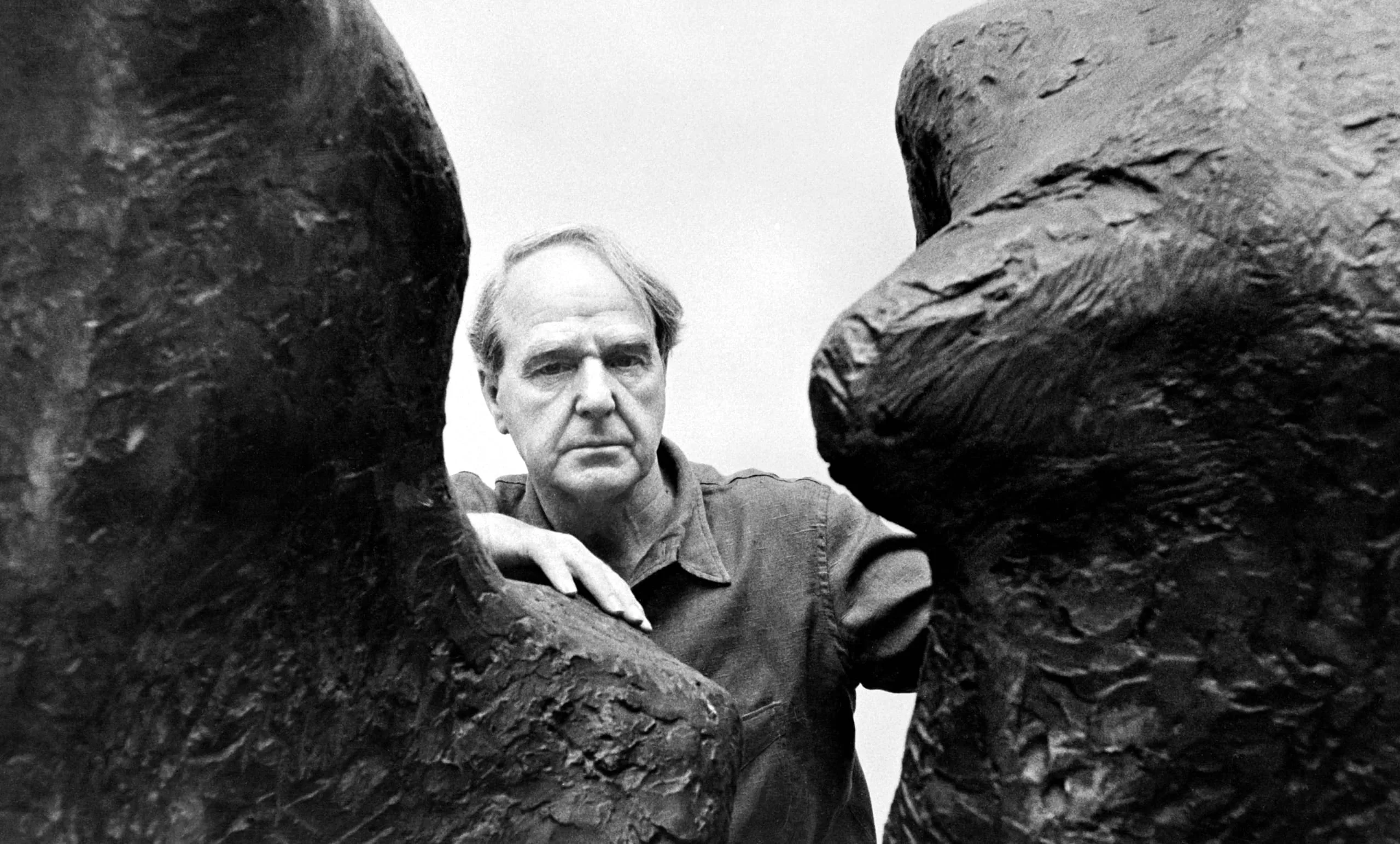 Black and white photograph of a man standing between two large, rough-textured bronze sculptures, looking directly at the camera
