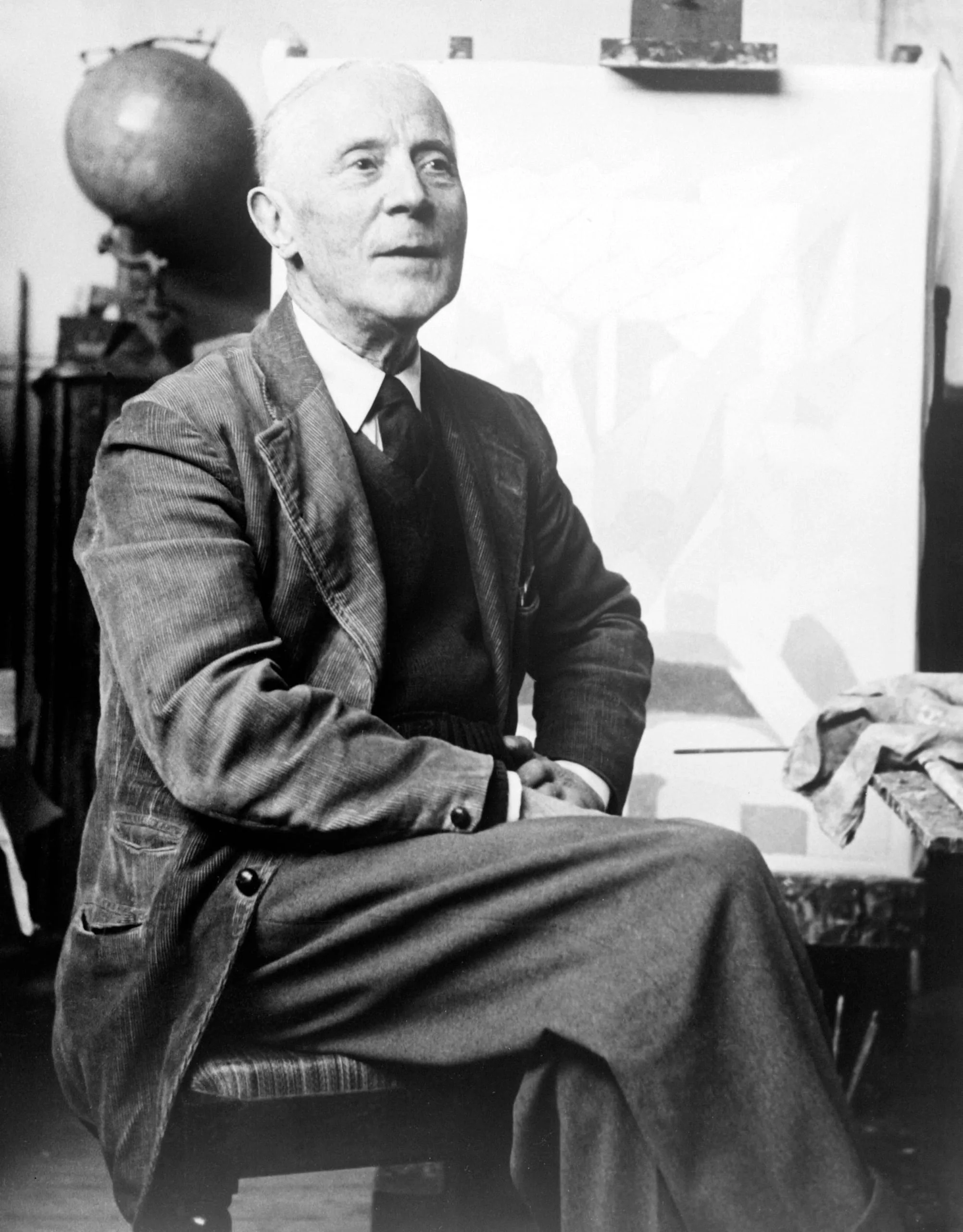 Black and white photograph of an elderly man in a corduroy jacket seated before an artist's easel, looking upward, with a globe visible behind him