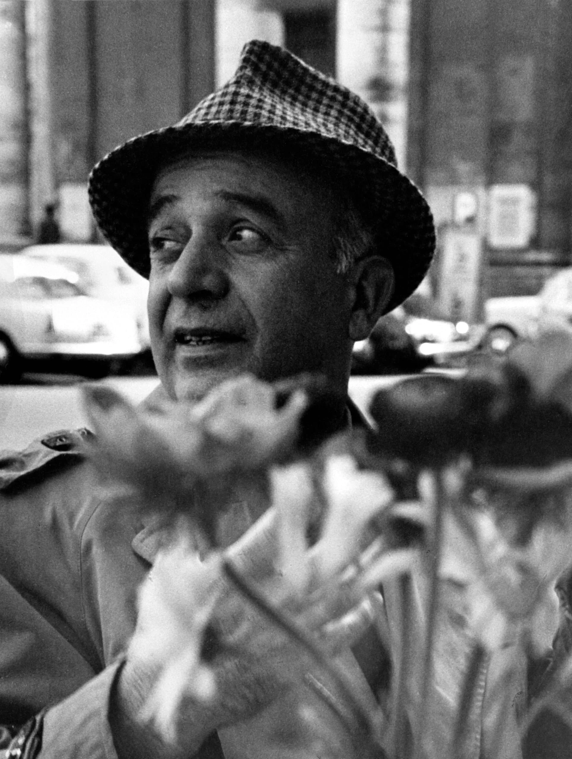 Black and white photograph, chest-up portrait of a middle-aged man in a houndstooth fedora looking upward, with blurred flowers in the foreground and an urban street scene behind