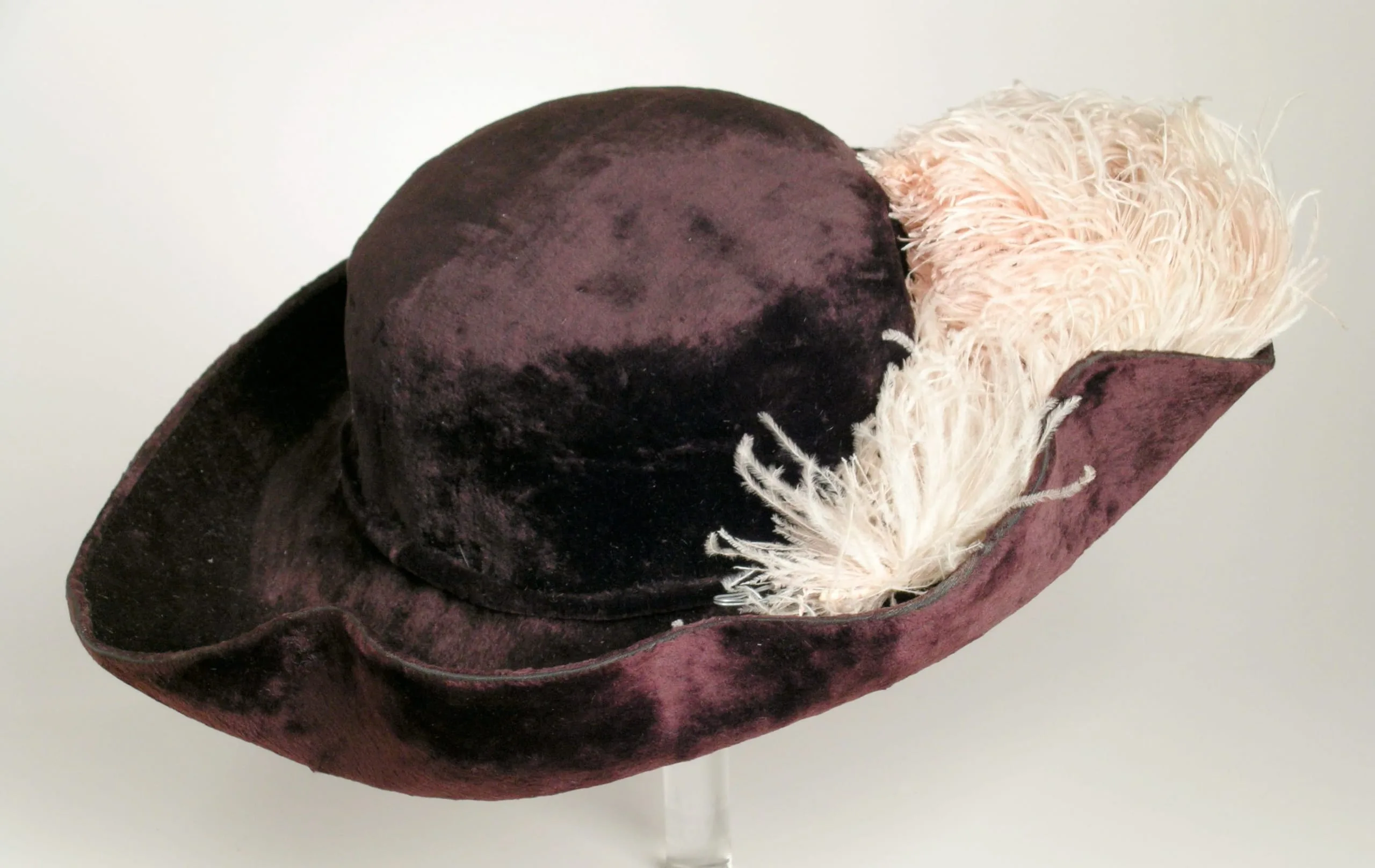 Wide-brimmed hat covered in deep aubergine crushed velvet, trimmed with a cluster of pale pink and cream ostrich feathers at the crown