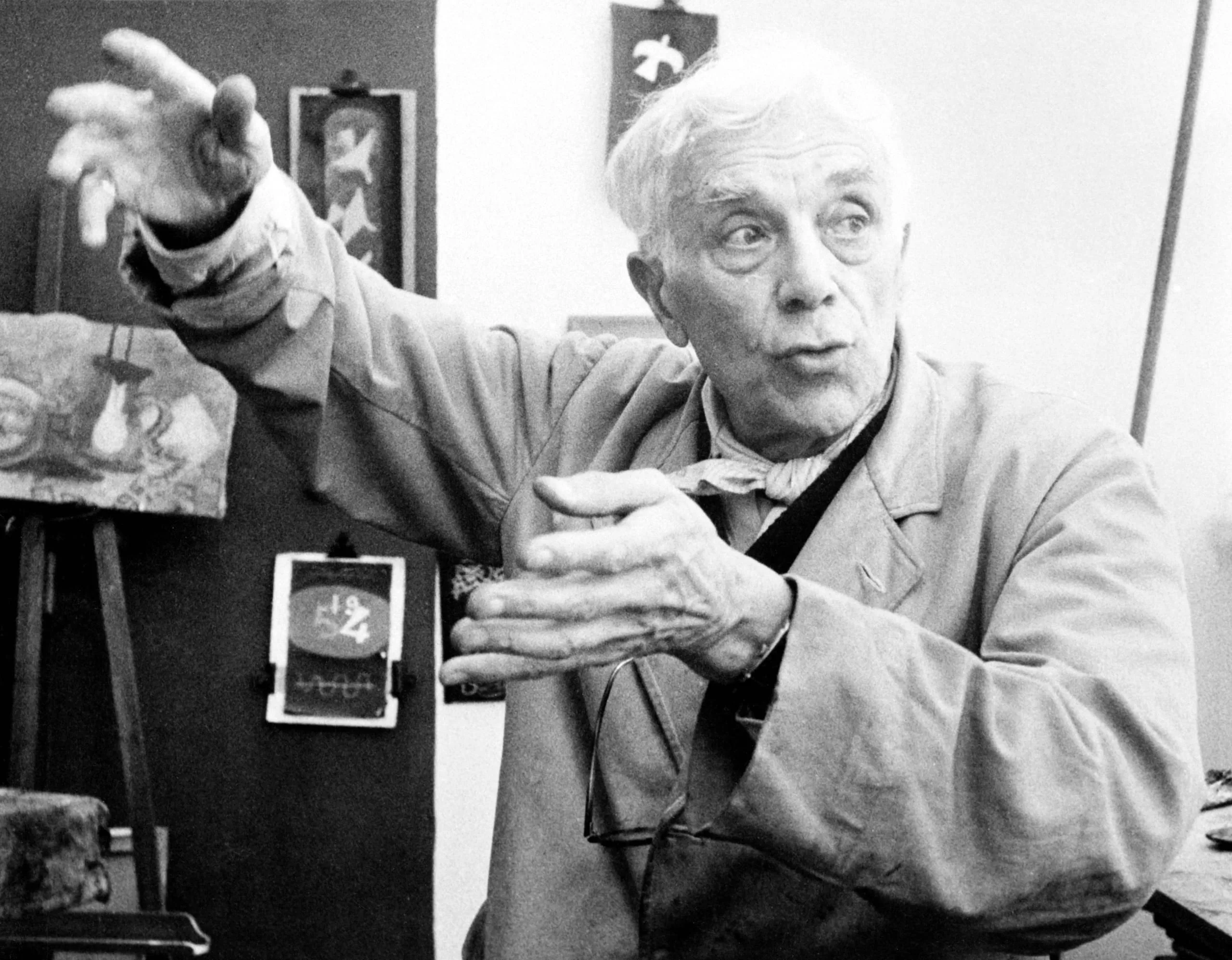 Black and white photograph of an elderly white man in a light jacket, gesturing with both hands as if speaking, with paintings on an easel visible behind him