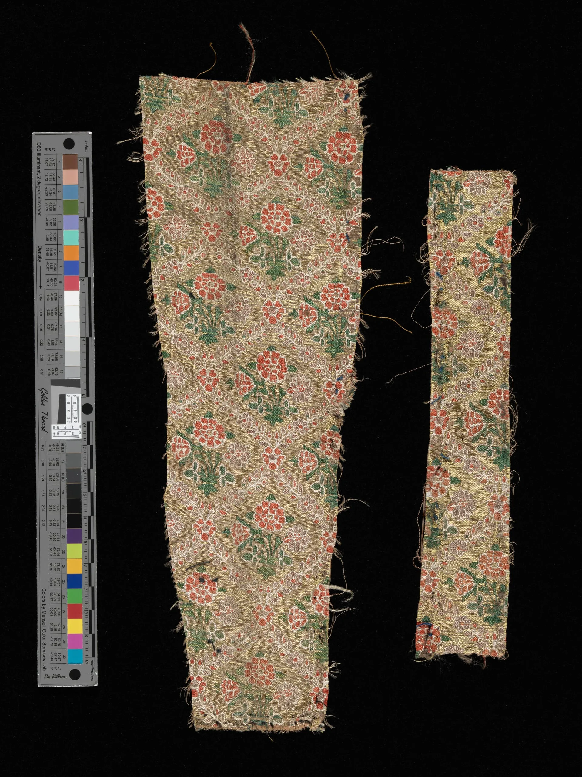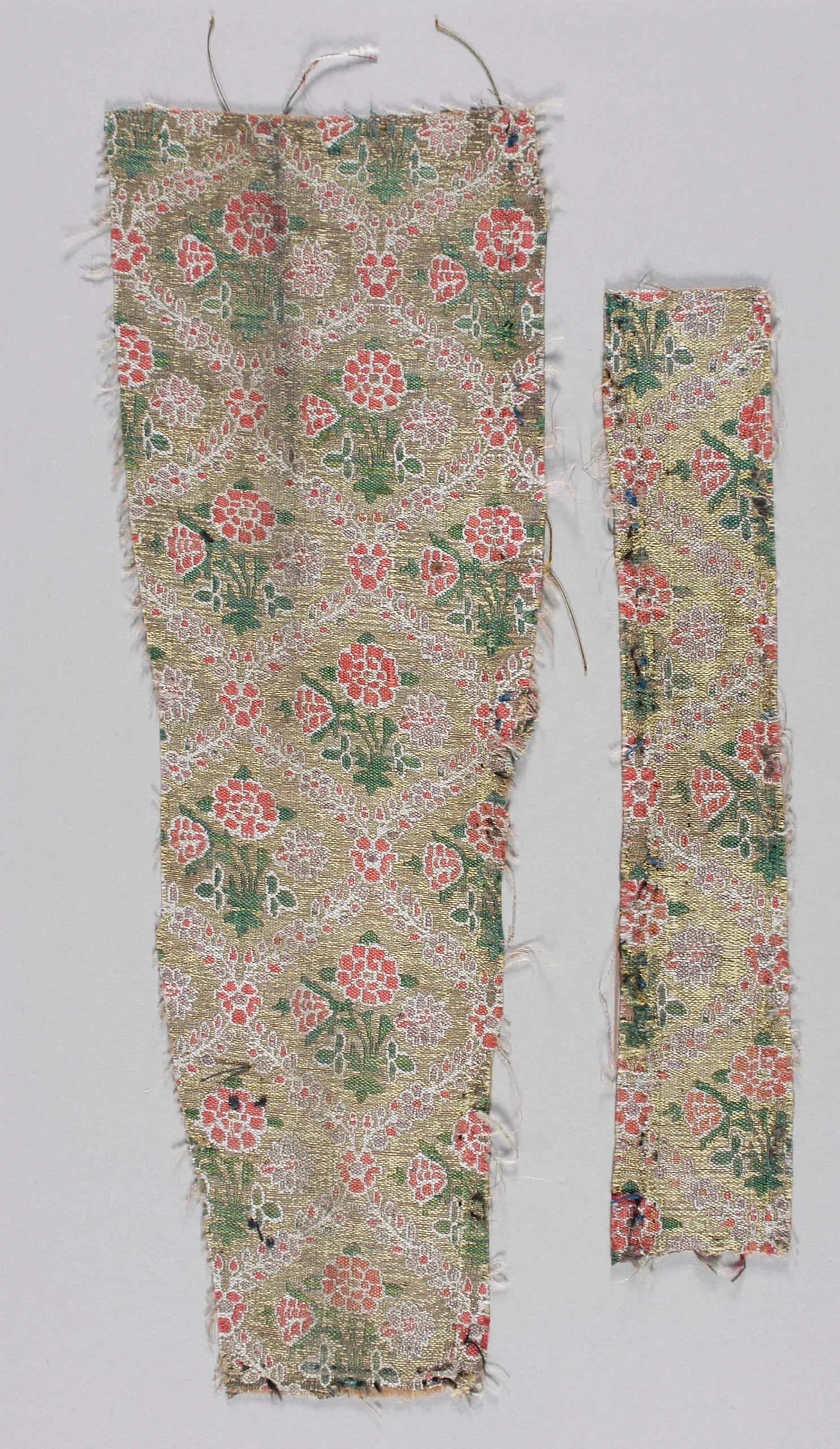 - Silk weft-faced compound plain weave (tacqueté) with metallic-thread supplementary-weft patterning