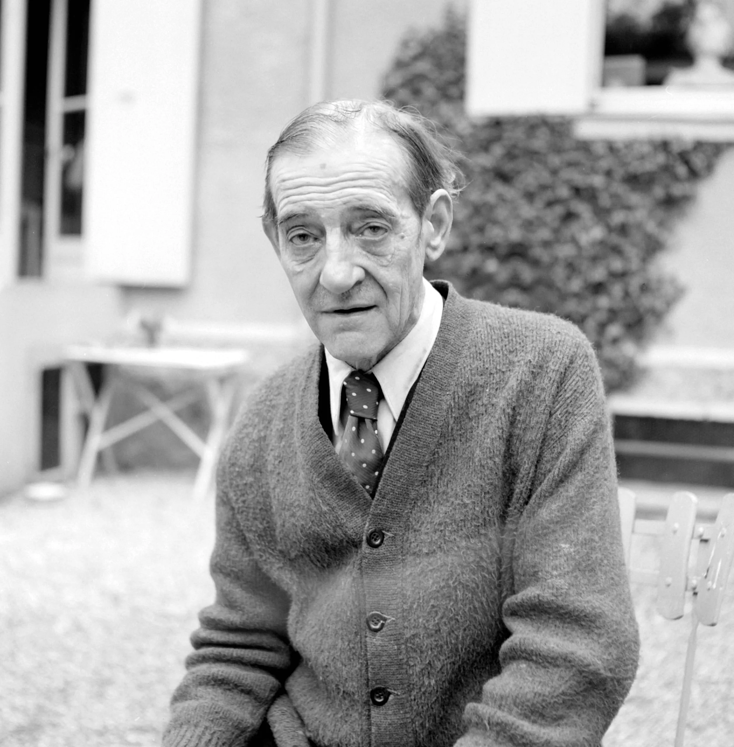 Black and white photograph of an elderly white man seated outdoors, wearing a cardigan and polka-dot tie, looking toward the camera with a softly out-of-focus garden behind him