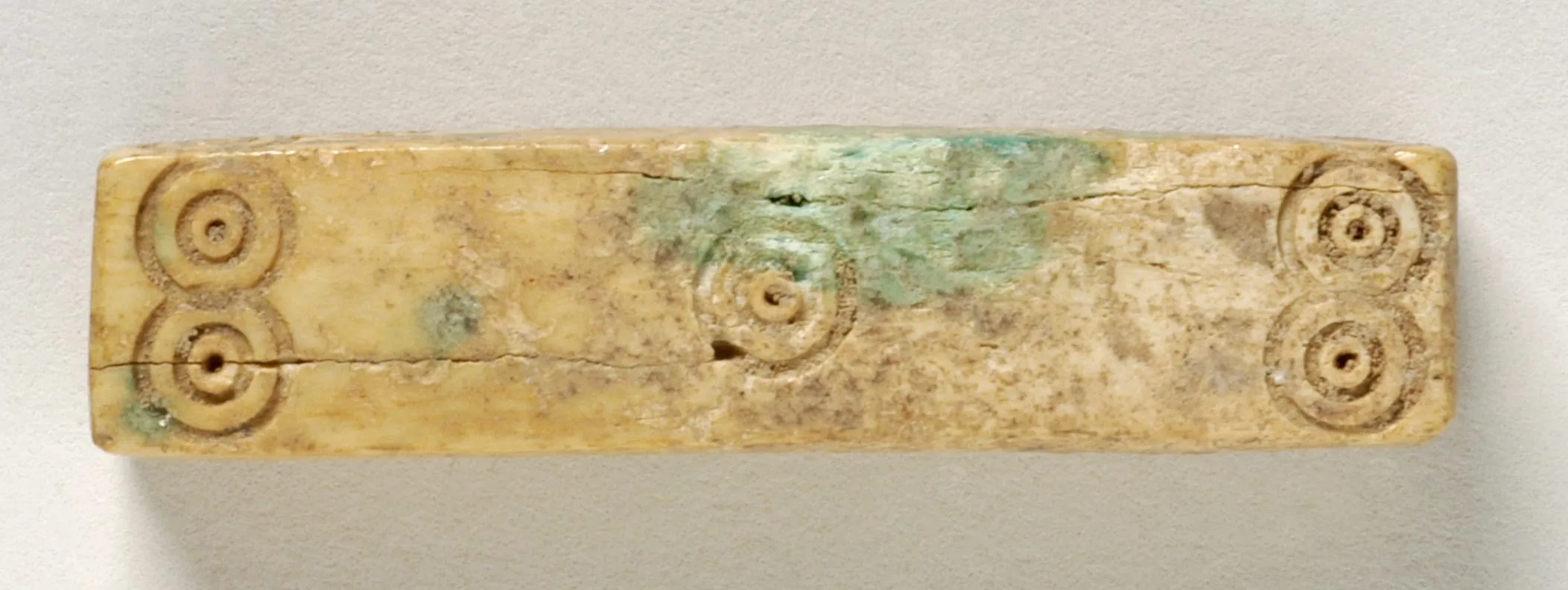 Carved from bone and decorated with circular carvings on all sides, these rectangular objects (also see M.2002.1.524 and M.2002.1.527) were likely a form of dice used to play backgammon and other games of chance and skill. Such games often entailed an element of gambling, which was forbidden by Islamic law but continued to be enjoyed by all levels of society in the medieval Islamic world. The use of dice in gaming seems to date to the fifth millennium BC, with the earliest surviving example coming from Syria.