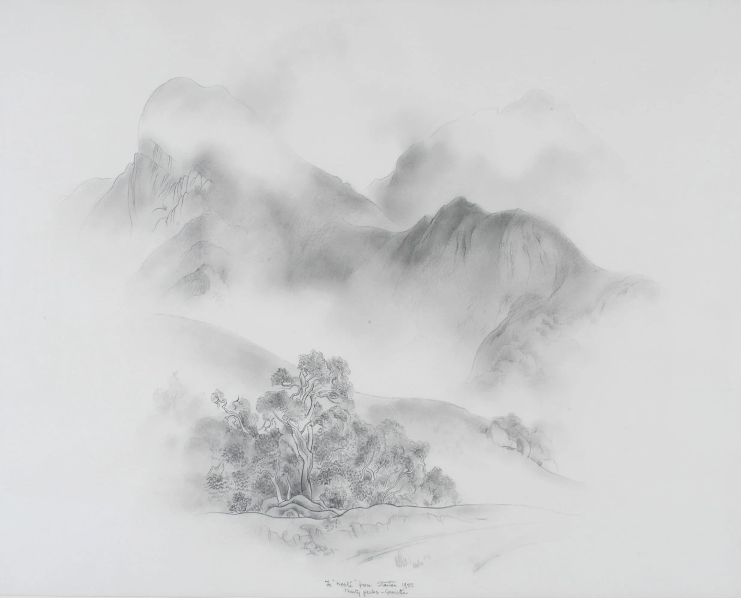Macdonald-Wright completed his drawings in an intentionally Asian-inspired manner, with broad spatial sections forming the overall compositions, subtly articulated details, and atmospheric transitions of light and shadow. Macdonald-Wright described this approach to his drawings, which depict California landscapes almost exclusively: I have attempted to transliterate the image from the objective world into the realm of the abstract approach. They represent in some degree the encroachment of classical Occidentalism on the pattern of Oriental conception. Artistically they suggest nothing more than the sensitive placement of tone. The effect of his artistic method is that the celebrated California landscape becomes unfamiliar in its appearance, imbued with an aura of enigma and fantasy.