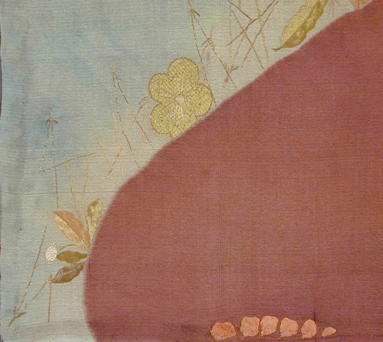 - Silk plain weave (crepe; chirimen), stitch-resist-dyed (nuishime shibori) and brush-dyed (hikizome), with silk- and gilt-paper-thread embroidery