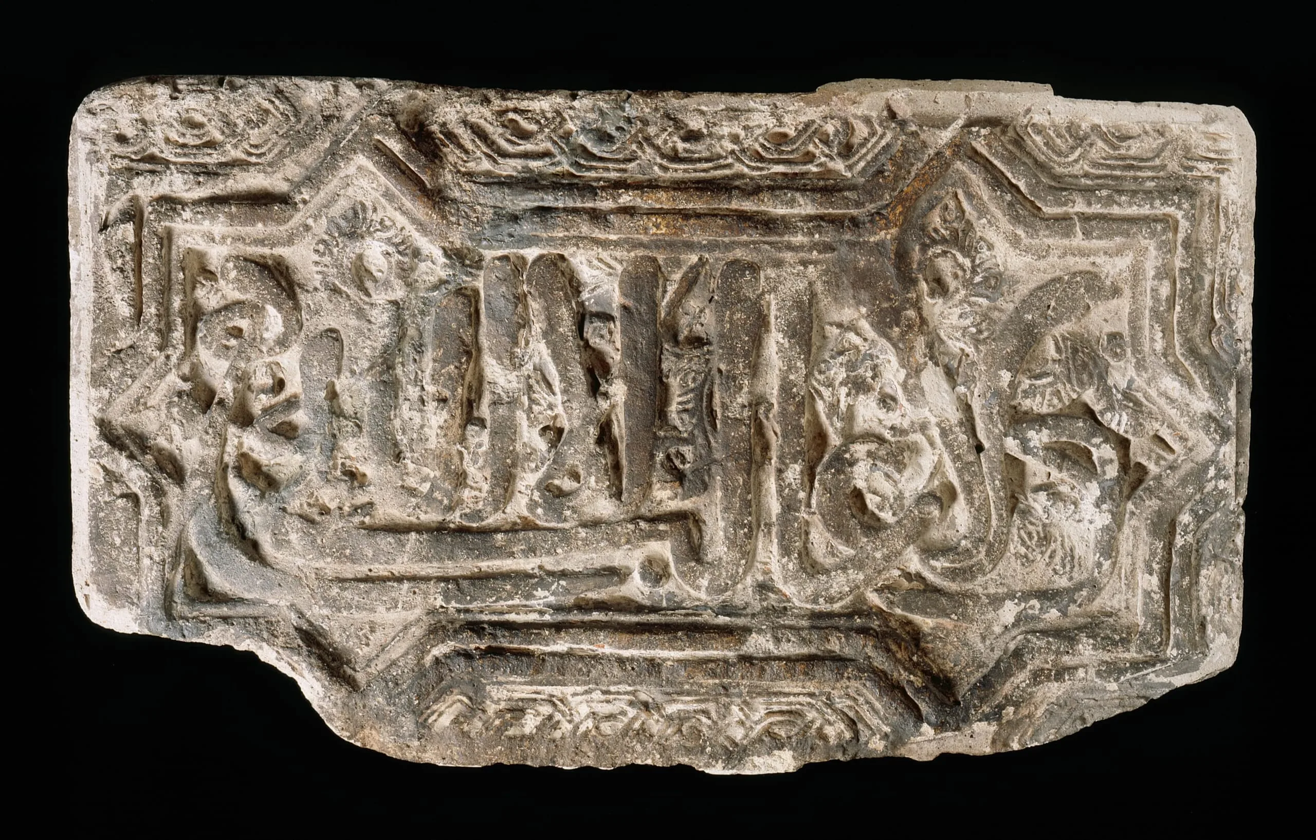 The Alhambra is the most significant artistic achievement of the Nasrids, the last Islamic dynasty in Spain. Both a well-fortified palace and a royal city, the Alhambra was guarded by stone walls and towers on the exterior, which conceal on the interior an elaborate succession of gardens, courtyards, and intricately decorated rooms, some of which had veneers of carved and painted stucco and colorful tiles. This stucco plaque is inscribed with the Nasrids’ dynastic motto: "There is no conqueror but God" (for the same inscription on a cuerda seca tile, see M.73.5.782).
