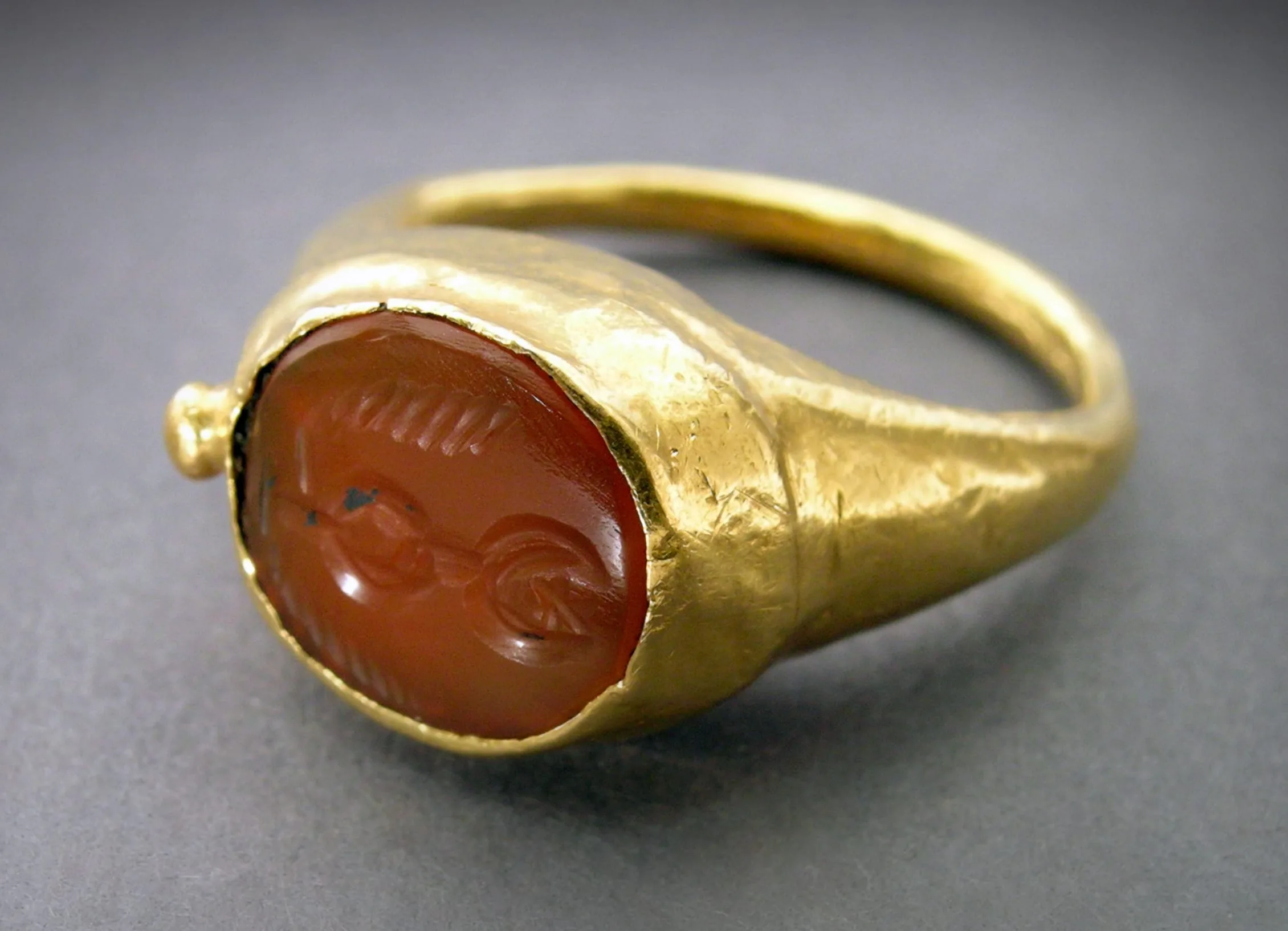 Gold finger ring with an oval carnelian intaglio stone set in a collet bezel, with worn surface and an engraved figure carved into the stone