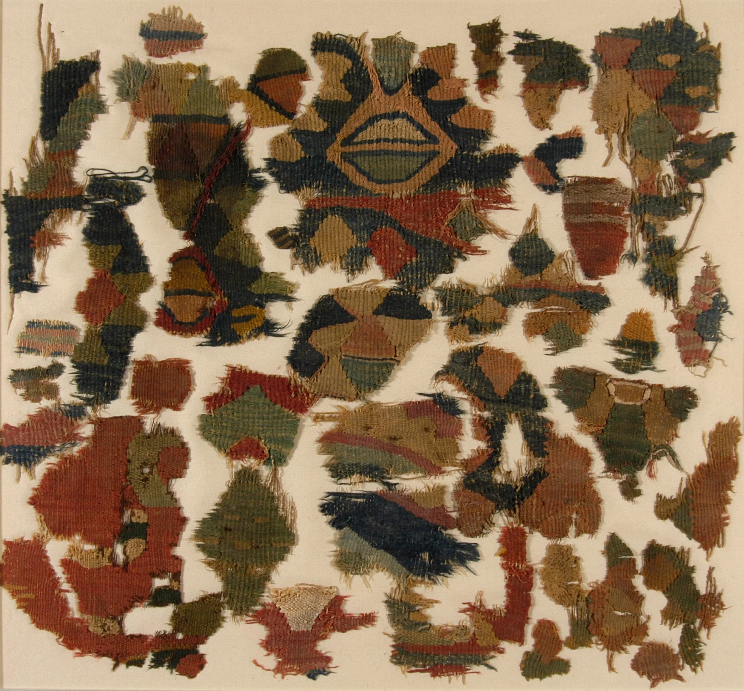 Textile fragment mounted on cream backing, composed of dozens of irregularly shaped woven scraps in brick red, army green, navy blue, and mustard yellow, with frayed edges and a central face-like motif