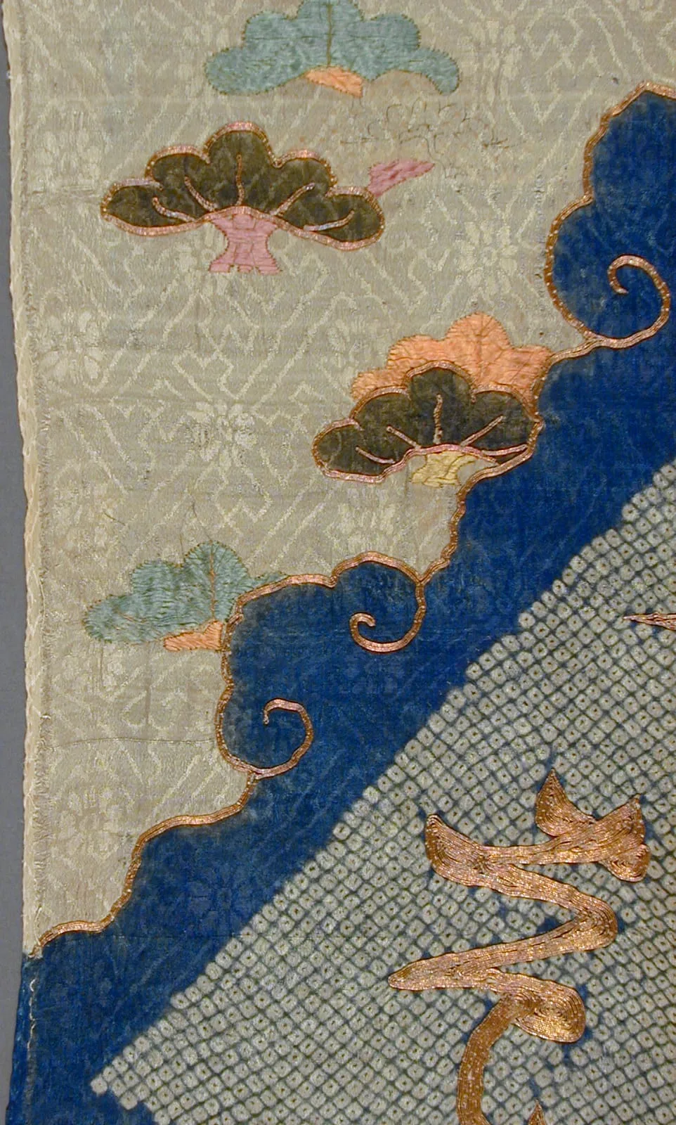 - Silk figured satin (rinzu), tie-dyed (kanoko nuishime shibori) with silk and gilt paper wrapped silk thread embroidery