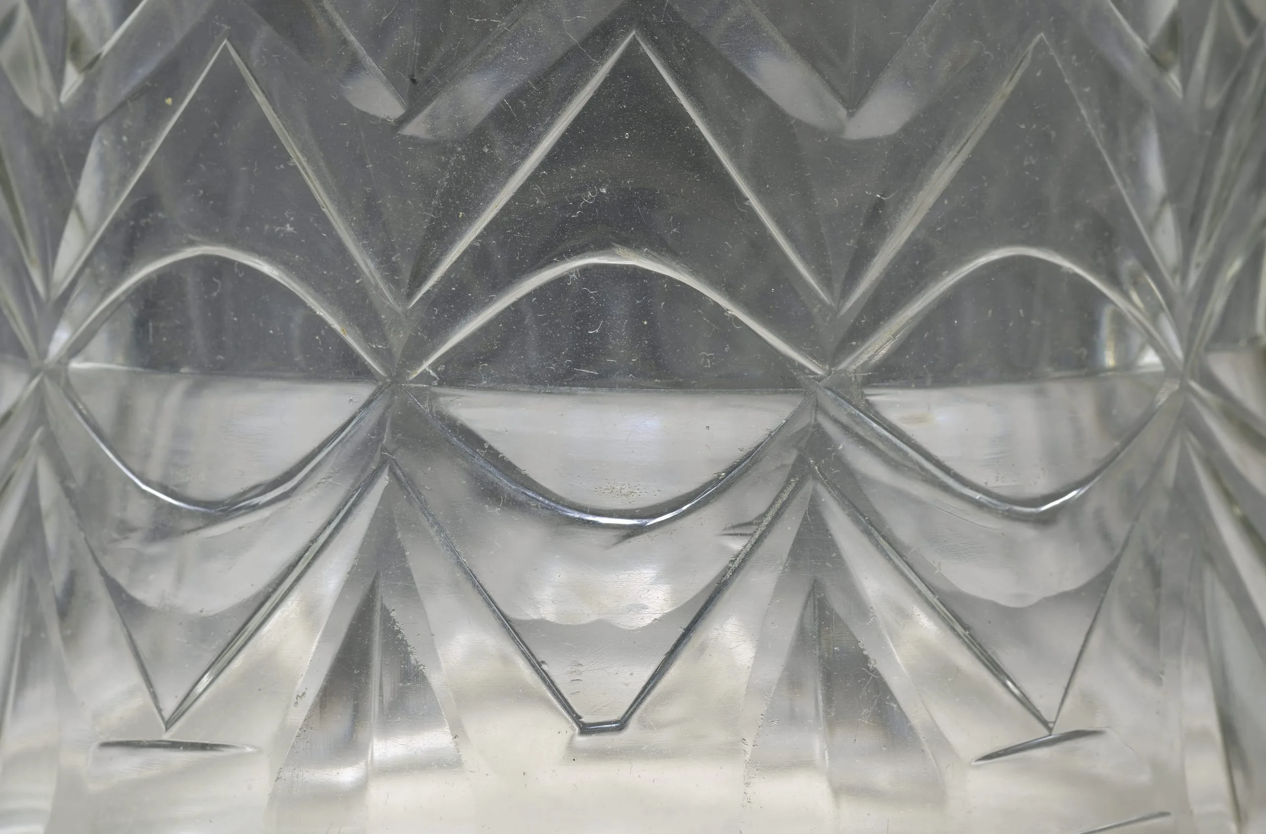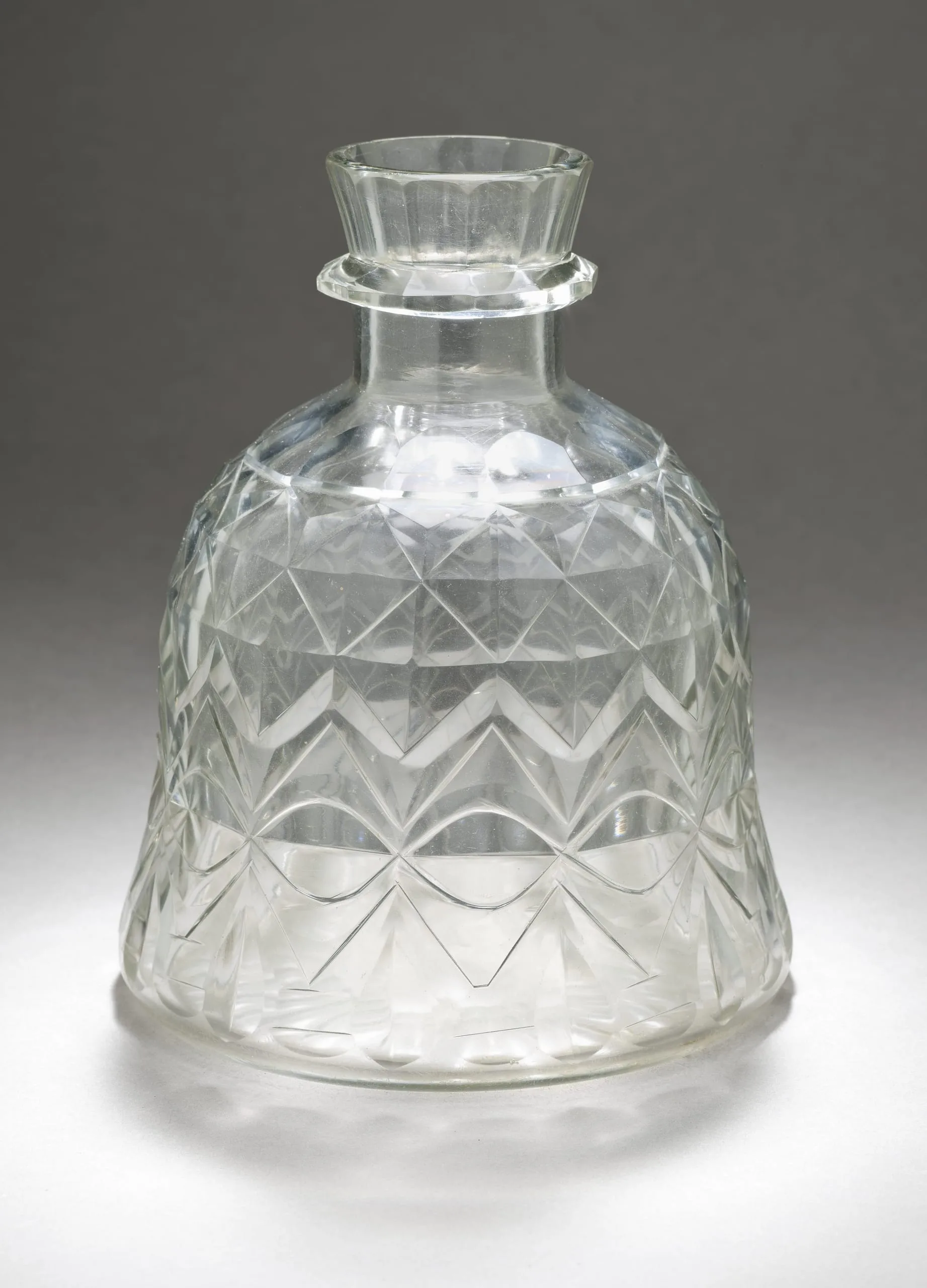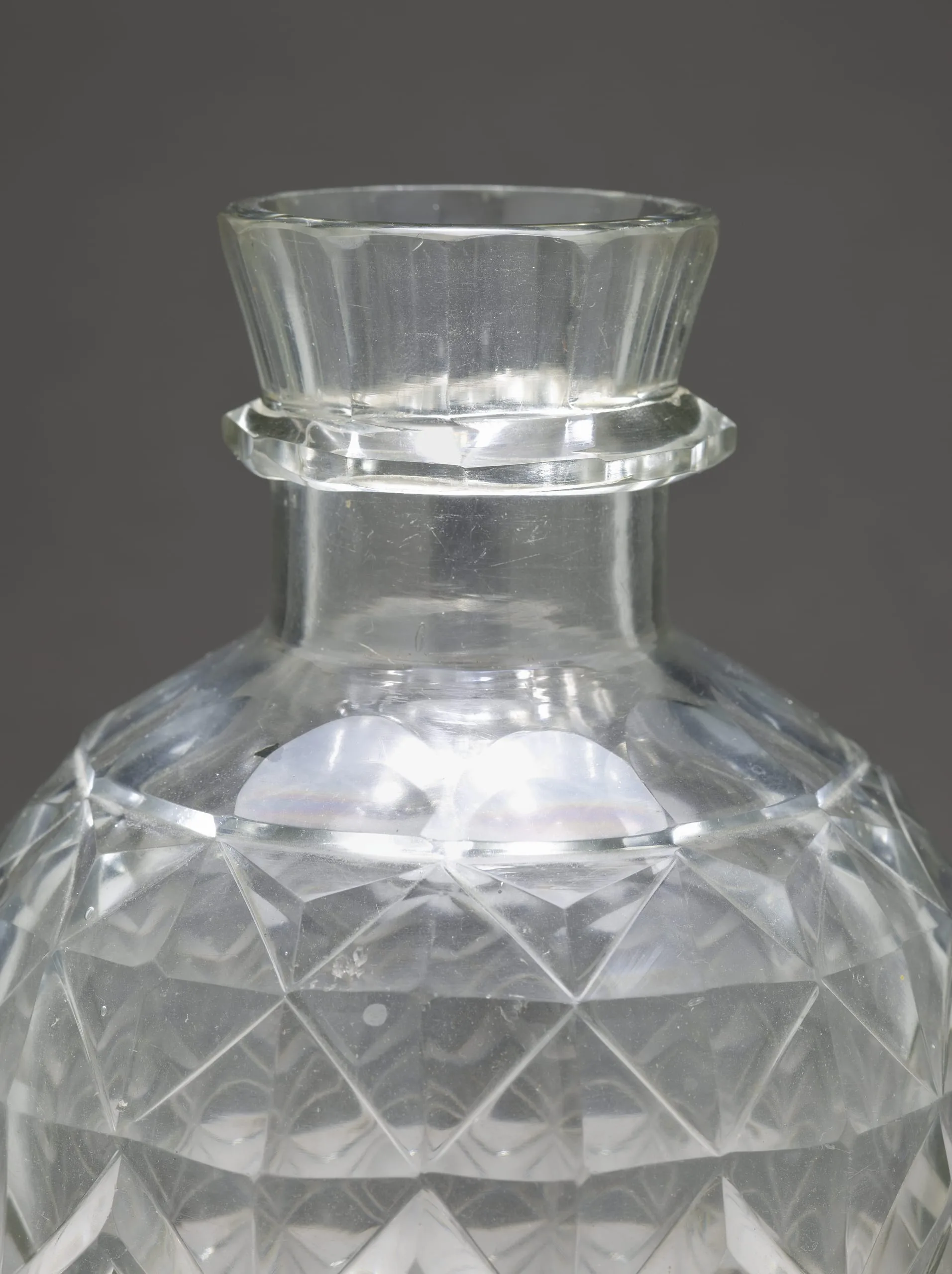 This hookah base is made of faceted lead glass. Its scintillating design features wheel-cut fluting in the neck above and beneath the projecting molding, which was used to facilitate grasping. From the shoulder downward, it has large triangular bevels arranged in a diamond pattern, a constricted waist embellished with a horizontal series of beveled ovals, and a basal border of beveled teardrops.