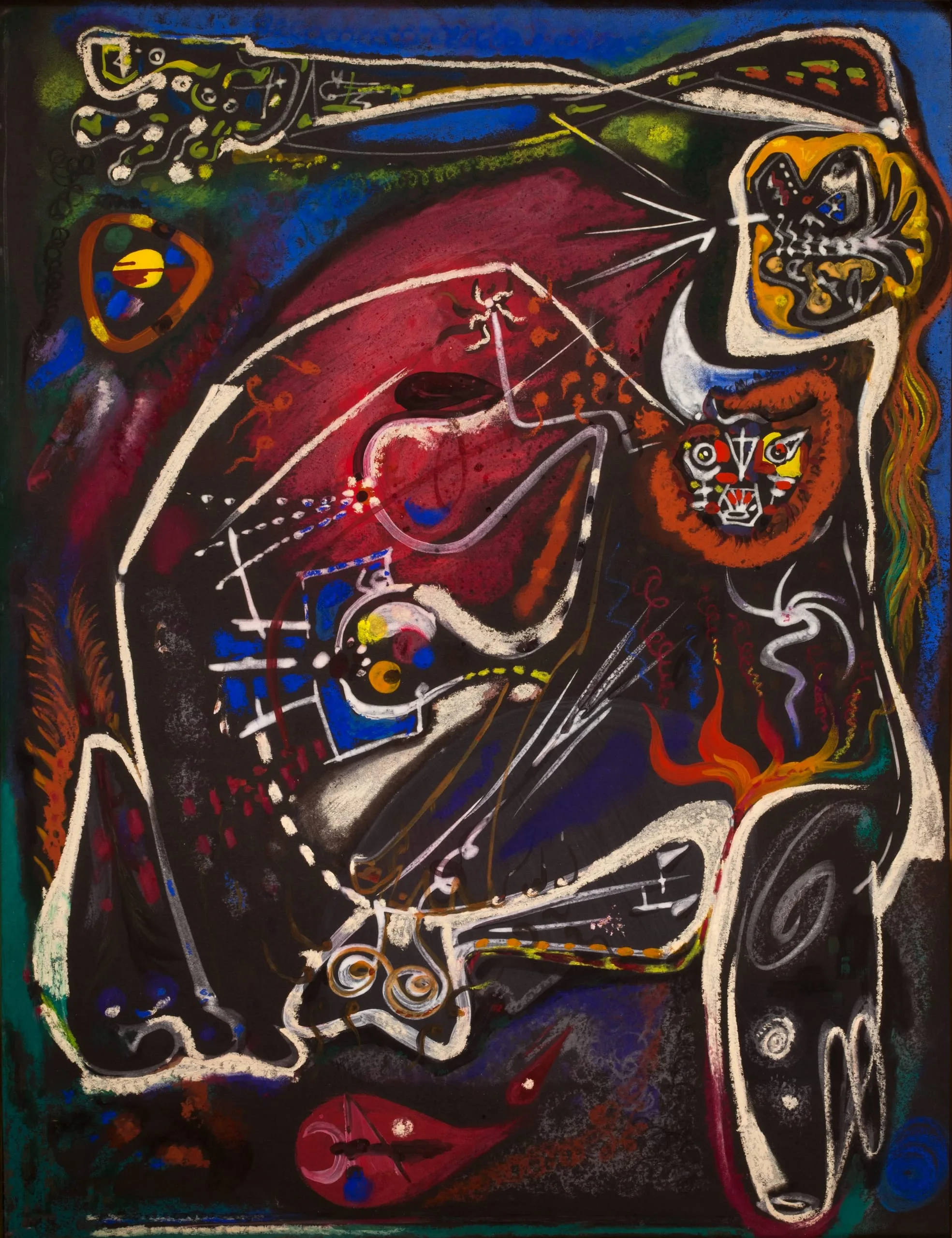 Following the Nazi invasion of France in 1940, Masson, his Jewish wife, and their children fled to the United States, settling in Connecticut until the end of the war. The Night dates to this period. Masson’s extended preoccupation with the story of Pasiphaë at that time may be interpreted as an indictment of the brutality and virulent irrationality of authoritarian regimes of his day, but it can also translate into a broader, more metaphysical inquiry around human nature and its relationship with art (designing and making things) and artifice (fantasy and deception). As evidenced by this drawing, Masson (among other Surrealists) has been considered an inspiration to the upcoming generation of Abstract Expressionists in the US