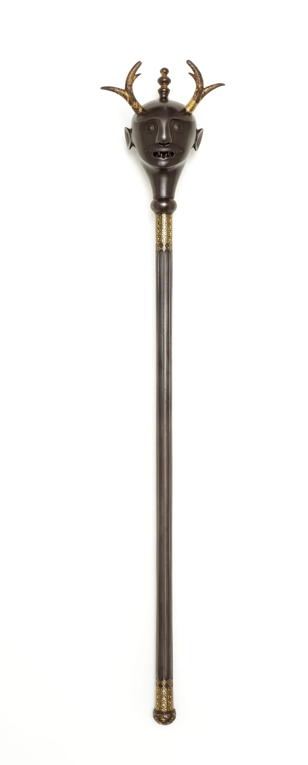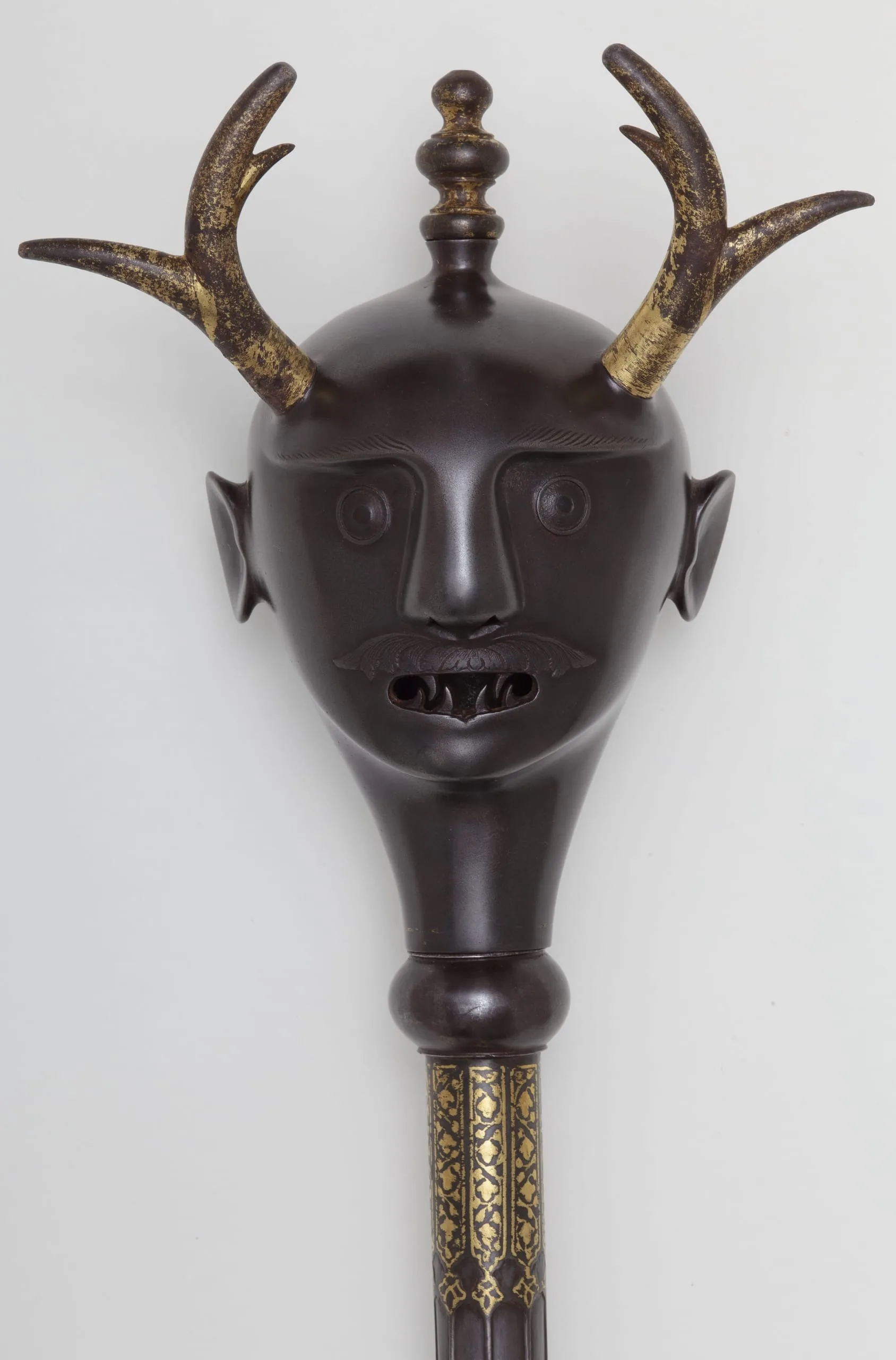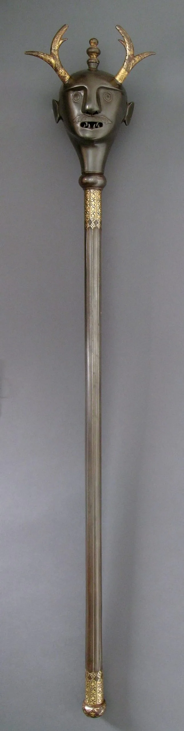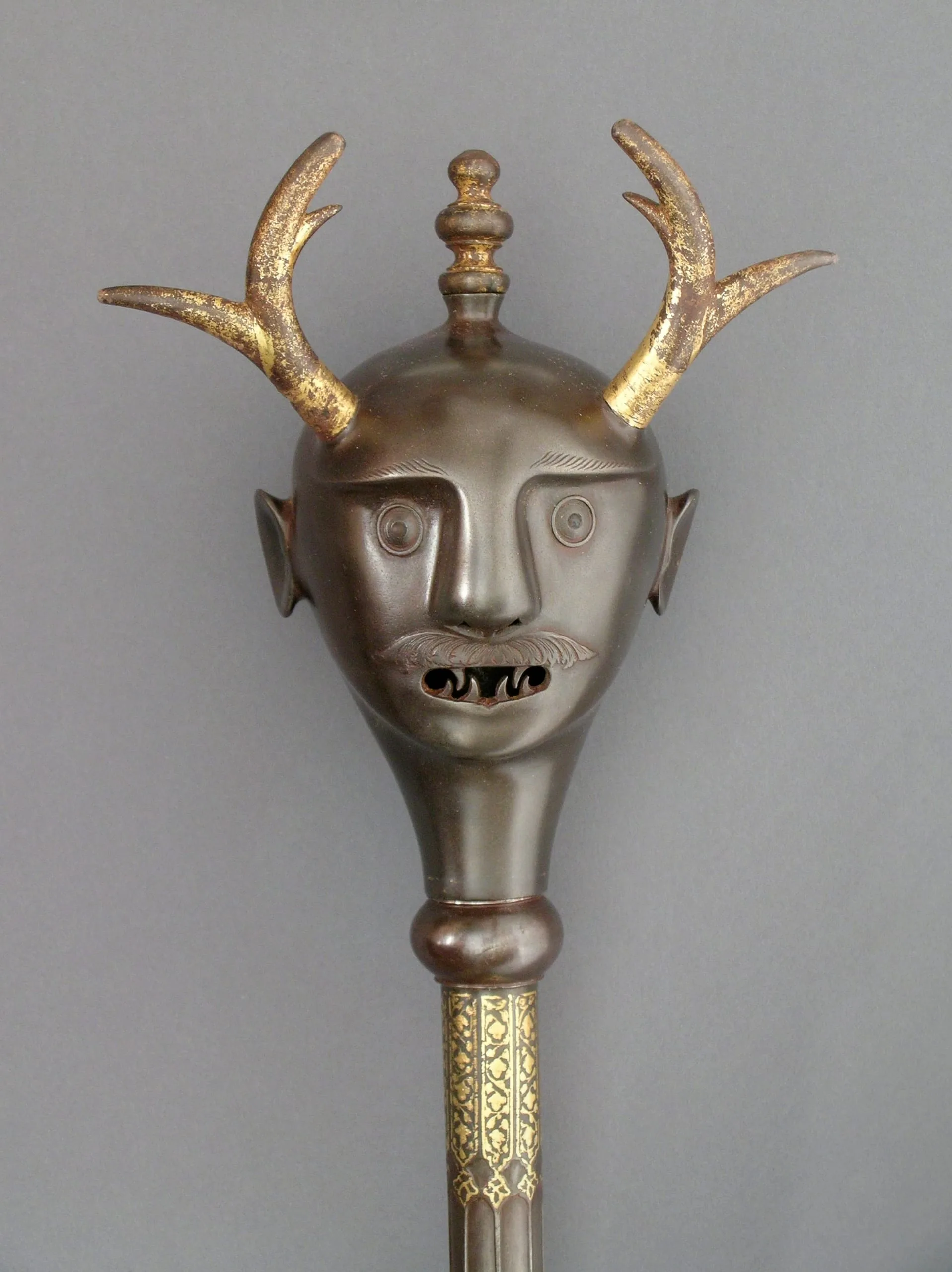 Maces were wielded on Iranian battlefields since pre-Islamic times; however, this nineteenth-century example was not intended for combat. Rather, with its elegant gilding and fanged demon head, this mace may have been used ceremonially in dervish processions or initiation rites, or as a prop in performances, including Shi‘ite religious dramas and staged recitations of the Shahnama, the Iranian national epic, whose heroes are often described as carrying emblematic maces.