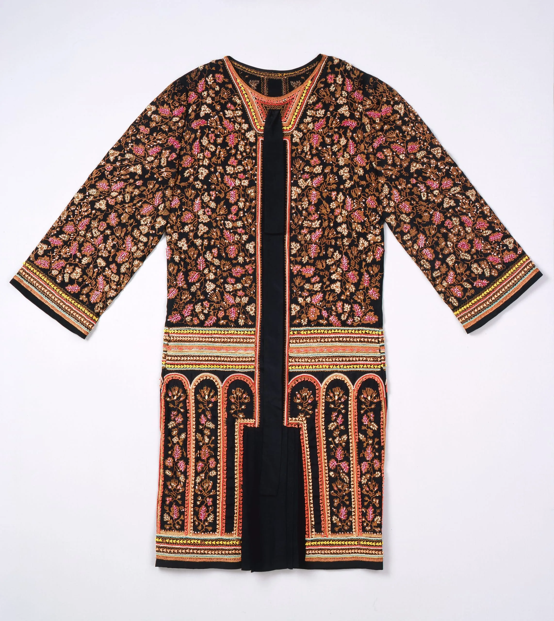 - Silk satin with metallic thread embroidery, silk embroidery, glass beads, and metal sequins