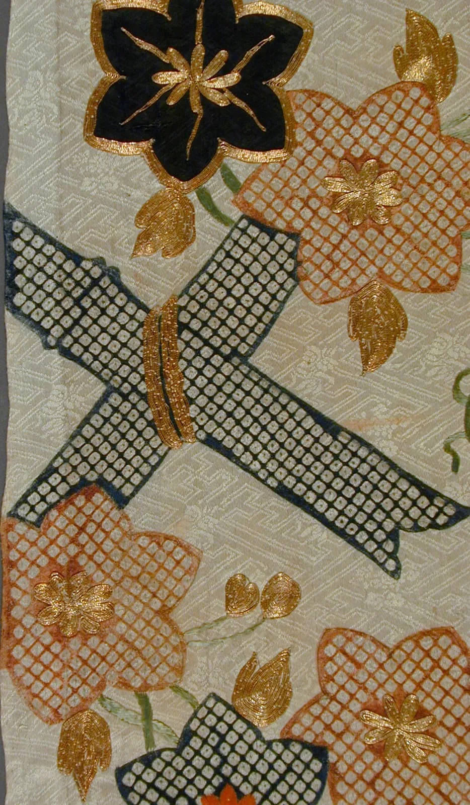 - Silk figured satin (rinzu), stenciled imitation tie-dye (kata kanoko shibori) with silk and gilt paper wrapped silk thread embroidery