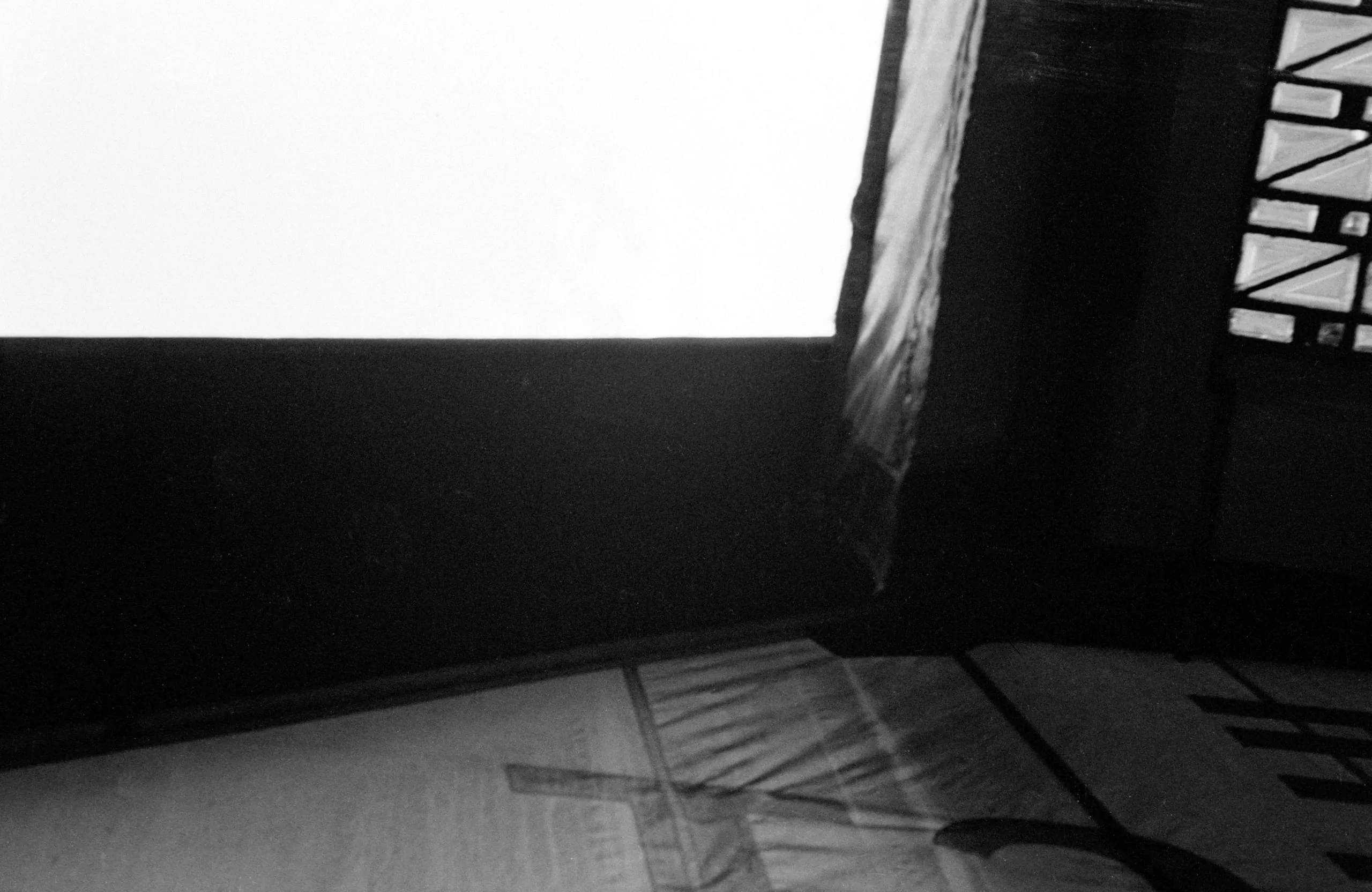 Black and white photograph looking up at a building interior corner, with overexposed sky at upper left, a dark horizontal band, a hanging translucent panel, and a patterned floor with bold geometric markings
