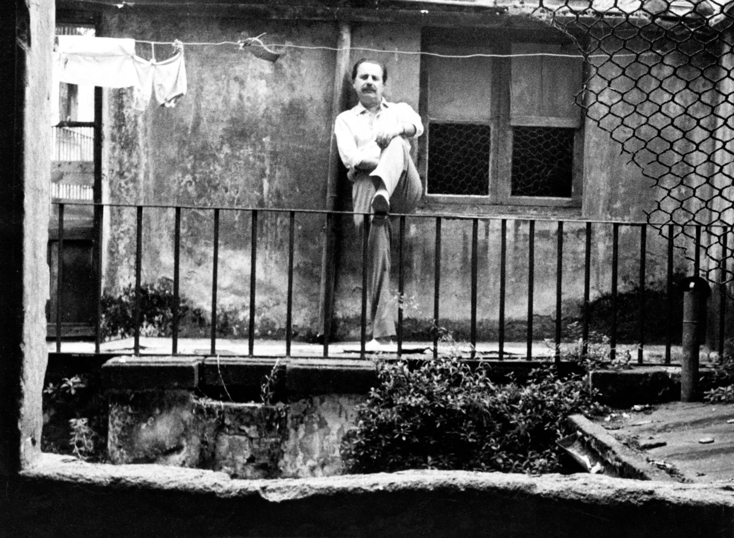 Black and white photograph of a man with a mustache sitting atop a metal railing outside a weathered building, arms crossed, facing the camera