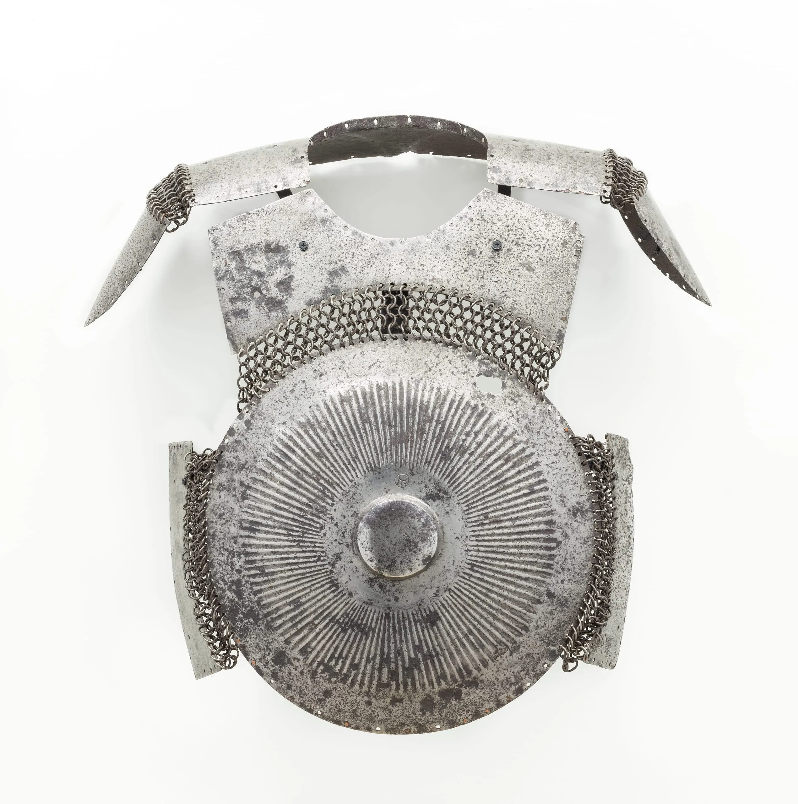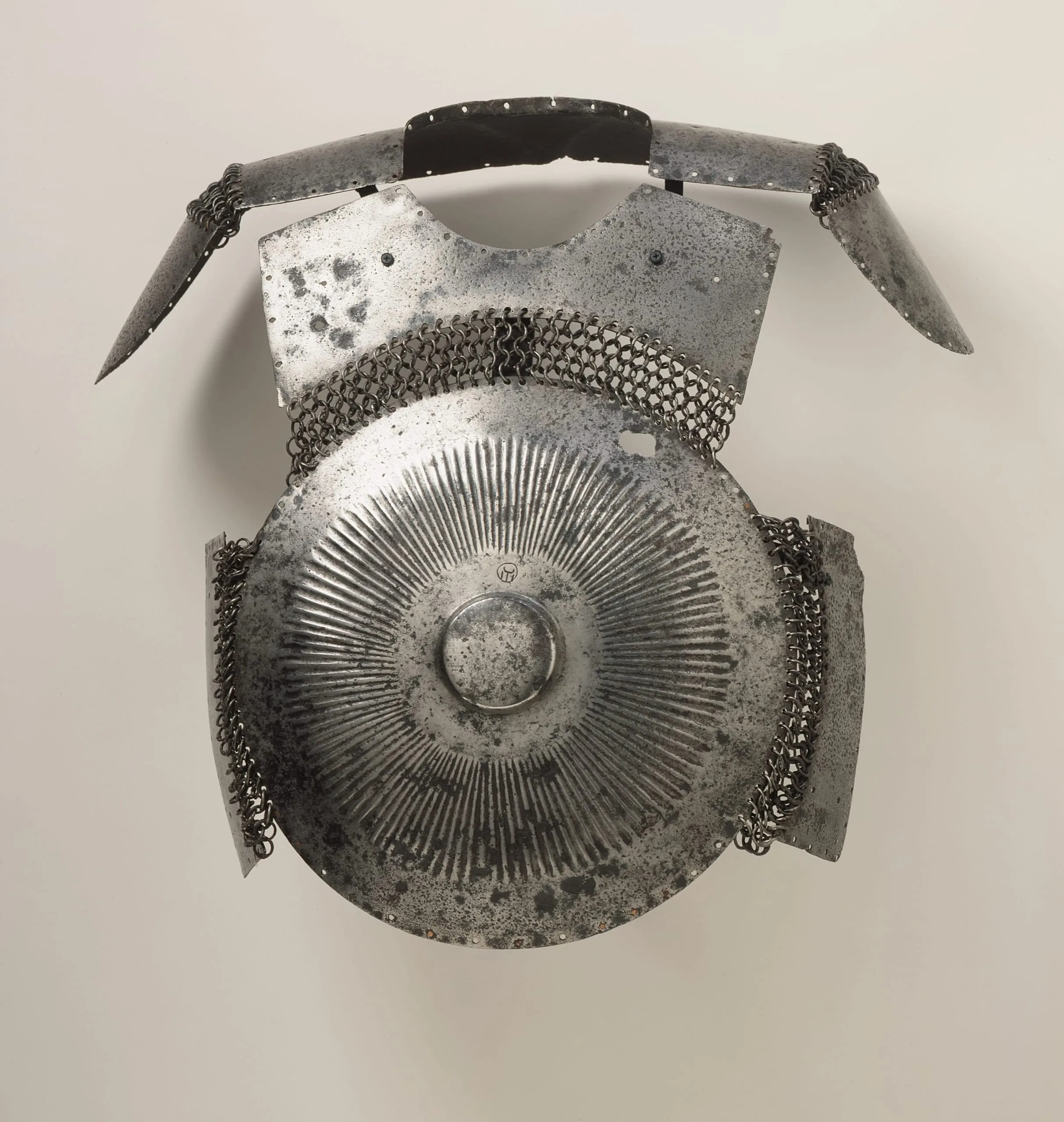 Decorated with a radiating sun, this circular breast plate once formed part of a set of body armor that would have included a shirt of mail with molded and rectangular plates and this circular element suspended across the chest of an Ottoman warrior, with a similar disk on the back, to protect his body from blows in battle. This type of armor was widely used in the Islamic world until the spread of firearms in warfare diminished its effectiveness. The small circle near the center of the disk, filled with a crescent and three lines, is an Ottoman arsenal mark, indicating where the armor was once stored.