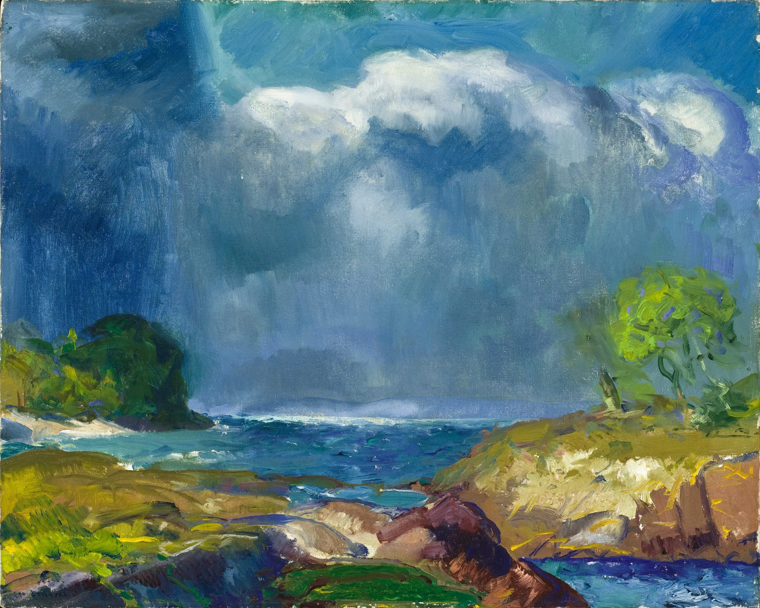 In 1911 Bellows began to summer in Maine. During his visits there, until 1916, he moved increasingly away from the almost exclusively urban subject matter of his early career and turned toward landscape painting. The Coming Storm was painted during June 1916, when Bellows and his family were summering in remote Camden, Maine, with LEON KROLL. Early in their stay they were visited almost daily with storms, and Bellows’s paintings from June and July are among his most dramatic in their contrast and energetic brushwork. By this time he was systematically using the Maratta palette, and The Coming Storm is fairly strong in color despite its overcast tonality. In his record book the artist indicated the color scheme for his painting as follows: