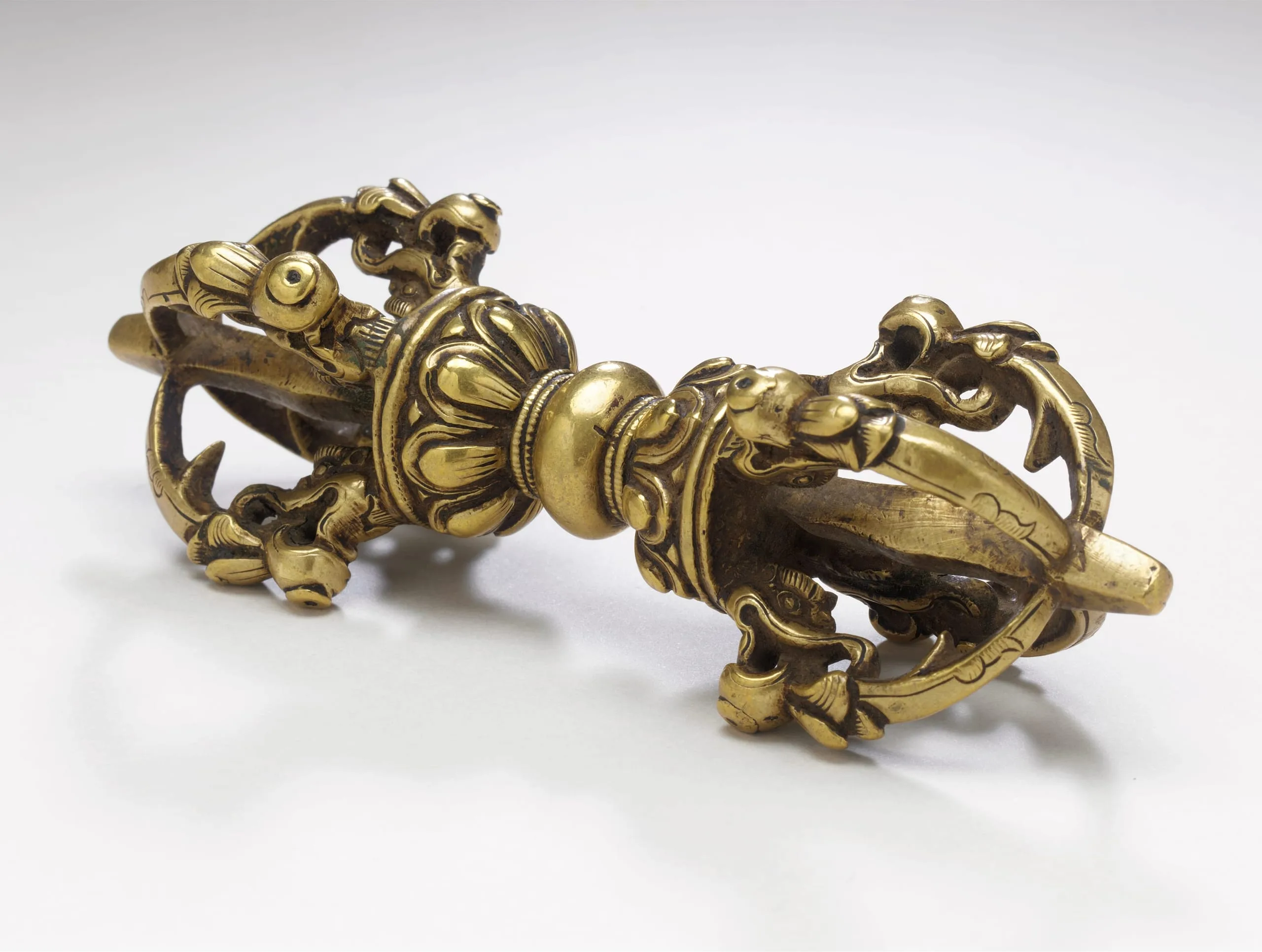 The thunderbolt’s longitudinal shaft symbolizes the cosmic pillar or axis mundi. The middle has a ring molding abutted by lotus pedestals. The ends are identical but are understood as symbolizing the male and female aspects. Each end has five prongs (four blades issuing from a mythical aquatic monster (makara) and the central axis), which represent the five Jina Buddhas and their respective transcendental insights. See the paired bell (M.2001.158.2).