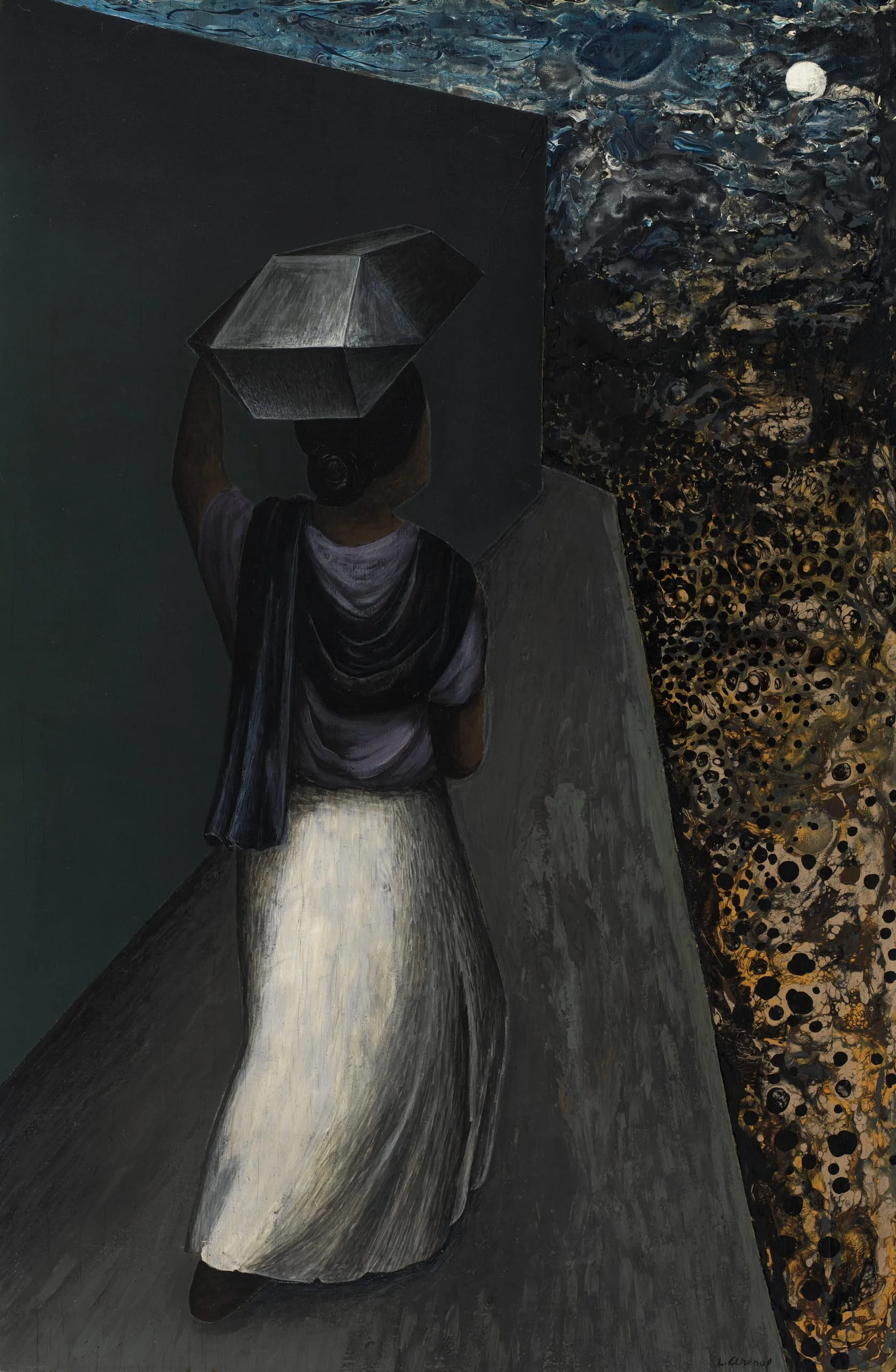 Woman Carrying a Coffin (Mujer cargando un ataúd) shows an indigenous woman seemingly walking into infinity with a coffin on her head; the right side depicts an eerie sky created with a dripping technique. Luis Arenal Bastar participated in David Alfaro Siqueiros's legendary Experimental Workshop in New York, which was founded in 1936. The workshop was designed as a laboratory for experimentation, and artists were encouraged to use unconventional materials such as industrial paint, as well unconventional methods such as pouring, dripping, and splattering to create the effect of controlled accidents. Ilona Katzew, 2008