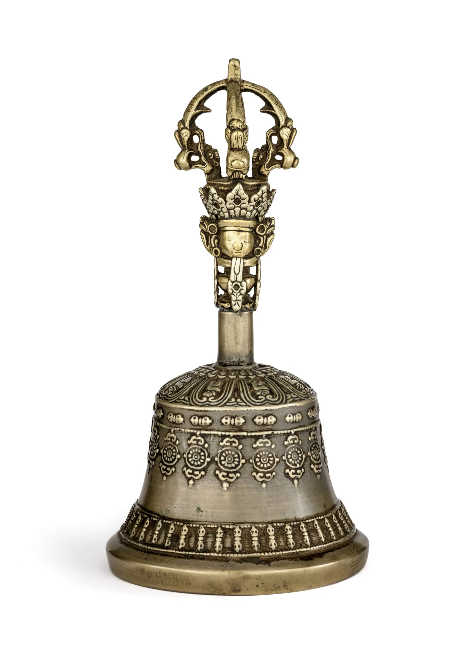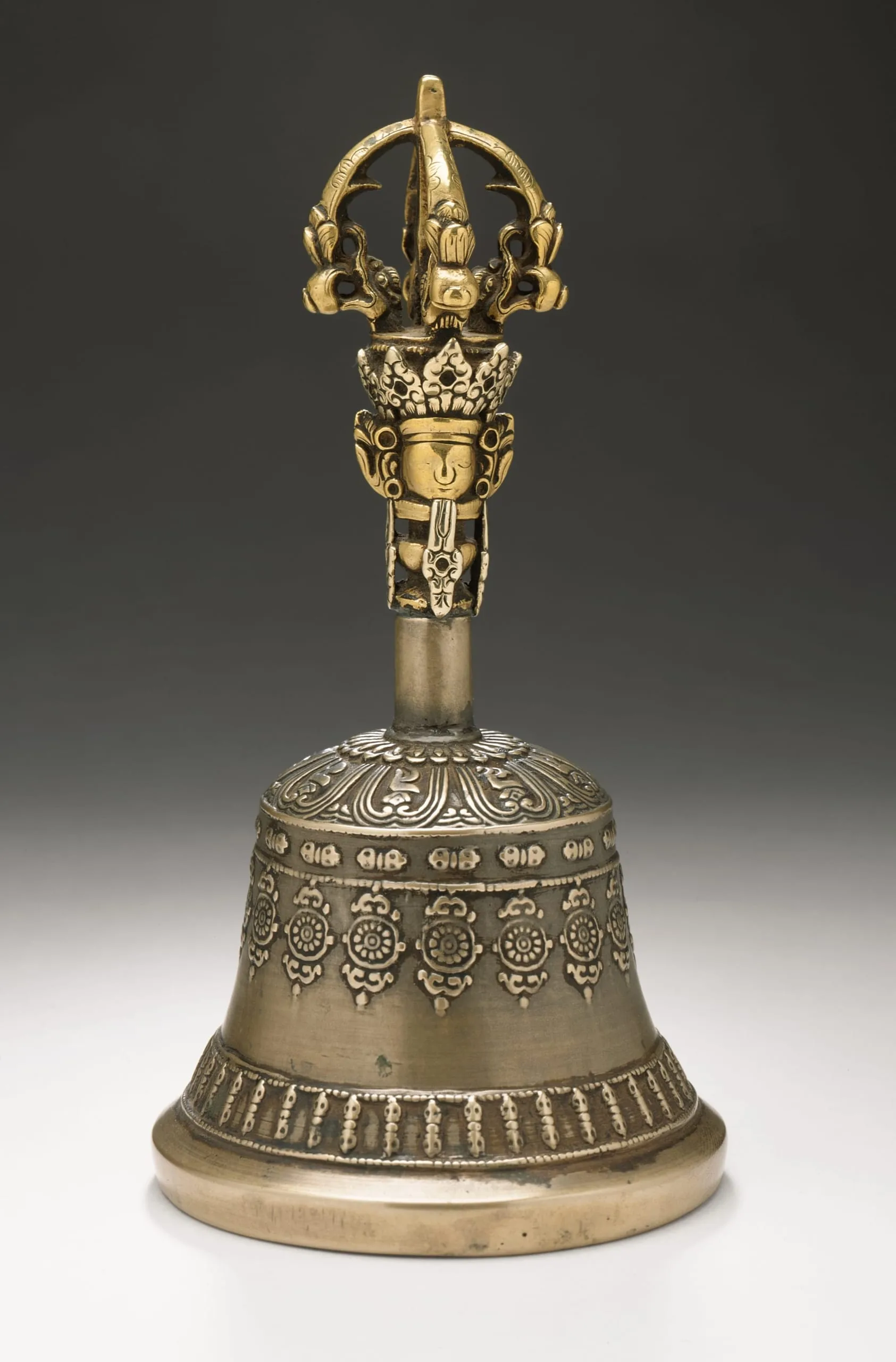 The bell’s handle is a shaft with the crowned head of Prajnaparamita emerging from a vase of plenty. The terminal is a five-pronged thunderbolt identical in form to its paired thunderbolt (M.2001.158.1). The bell’s shoulders have registers of lotus petals and Tibetan characters. The body has a row of horizontal thunderbolts, a series of Dharma-chakra motifs, and a band of vertical thunderbolts along the base.